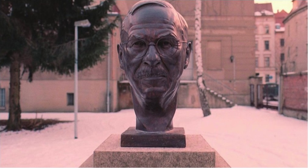 通常来说用升、降镜头拍摄的物体和环境一定是规模和场景较大的,能够在升降画面中突出其庞大的气势或是为了表现某一重要情节的细致刻画。在电影《布达佩斯大饭店》中,开篇的作家雕塑碑像用到了升镜头,展现了读者对他的崇拜之意,如图2-2-63至图2-2-66所示。