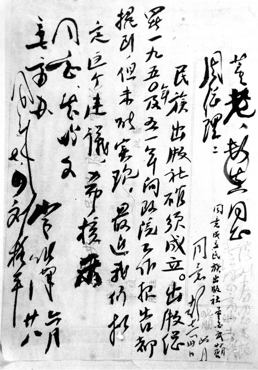 为什么有了参事室还要建立出版社?有了出版社为什么还要建立翻译局?为什么合并?又为什么再分开设立并扩大?这都是国家大政方针、时代需求有关。1949年周总理就有建立民族出版社的想法,到1952年才立项。众所周知,新中国百业待兴,人才缺,资金短;还要进行土地改革、制定“一五”规划,外交和内政都有做不完的大事。随着抗美援朝战争的胜利,国民经济得到复苏,时机已经成熟。根据《我们的回忆》(民族出版社,2013年)记载,建立民族出版社,其实是周总理的意思。那是1949年12月16日,亚洲妇女代表会议在北京闭幕,邓颖超同志在家里设宴答谢为会议做翻译工作的同志,会后周总理把维吾尔语翻译穆提义留下来谈话,把这个想法告诉了他并提议他留在中央民委工作,为此事做准备。1952年6月28日李维汉、刘格平(中央民委主任、副主任)打报告给董必武和彭真(政务院政法委员会主任、副主任)同志,1952年6月29日董必武、彭真批示同意,7月4日周总理批示:“同意,望与文委商办。”出版总署署长胡愈之批示并上报政务院文教委员会:“……过去曾由该会参事室编印了一些少数民族文字的政治理论书籍,但随着新中国文化的发展,少数民族的出版物需要量迅速增加,原有非专业的编辑机构已不能担负此种任务。经该会与我署数度会商,决定成立‘民族出版社’。俾今后整个少数民族的出版工作有一个专门机构负责。”9月1日,政务院文教委复函同意。从6月28日报告到9月1日批准,只两个月多一点时间,足见党和国家对民族文化事业之关怀重视,折射了那个大干快上的建设年代之高效节奏。