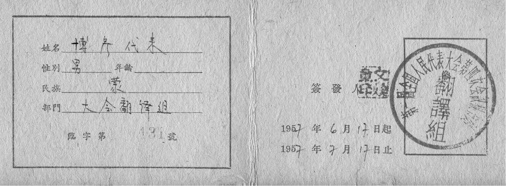 1957年博彦达赉参加第一届全国人大四次会议翻译组的证件。
