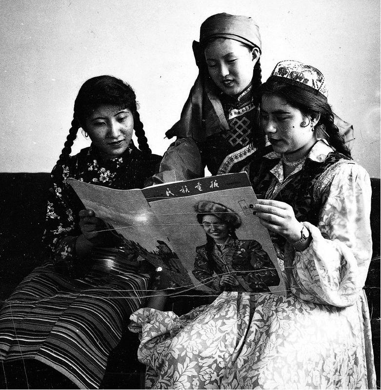 《民族画报》找各民族的女孩拍摄征订海报,中间的是李玉明。1957年