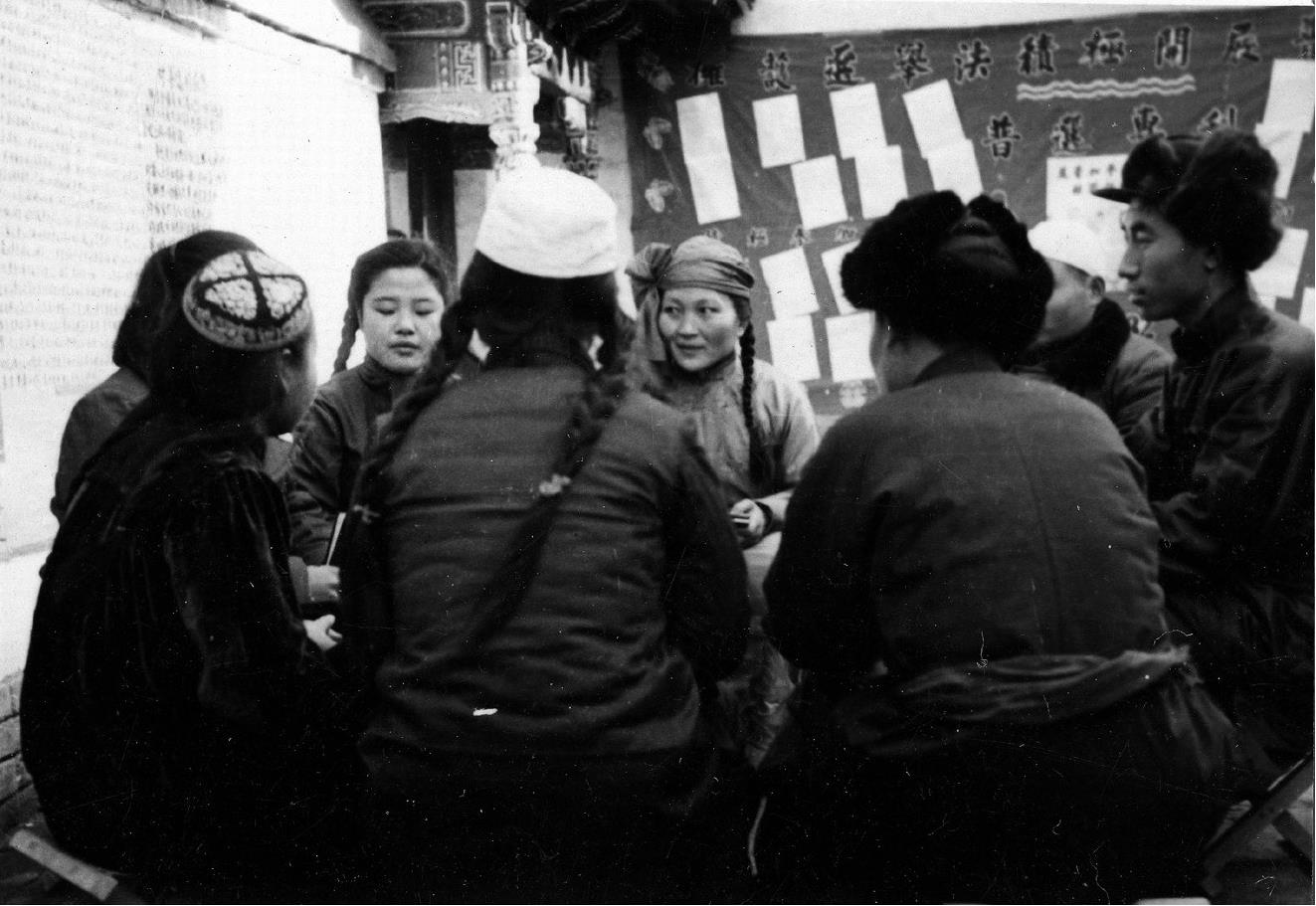 1954年民族出版社出版部职工王秀文(博彦达赉夫人、中间穿蒙古袍戴头巾者)为第一届全国人民代表大会做选举宣传工作。