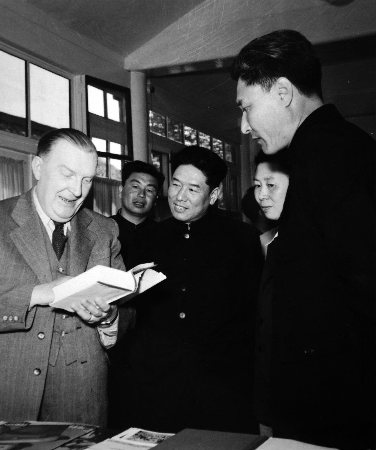 20世纪50年代萨空了(中)、李鸿范(右)接待外国出版同行。