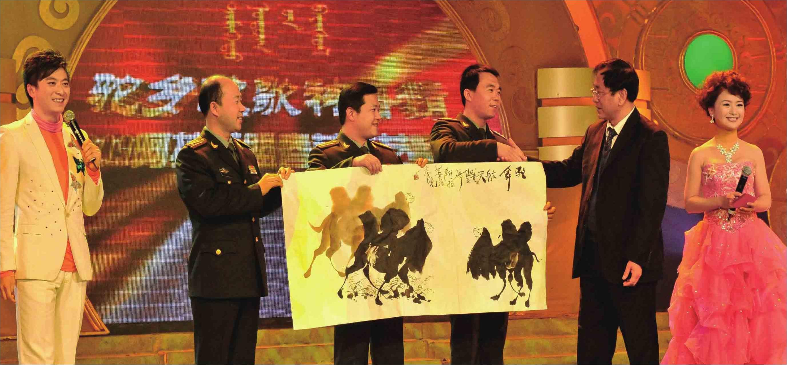 2009年1月,在阿拉善盟春节文艺晚会上,时任盟委书记王玉明向东风航天城代表赠送现场绘画《骆驼》