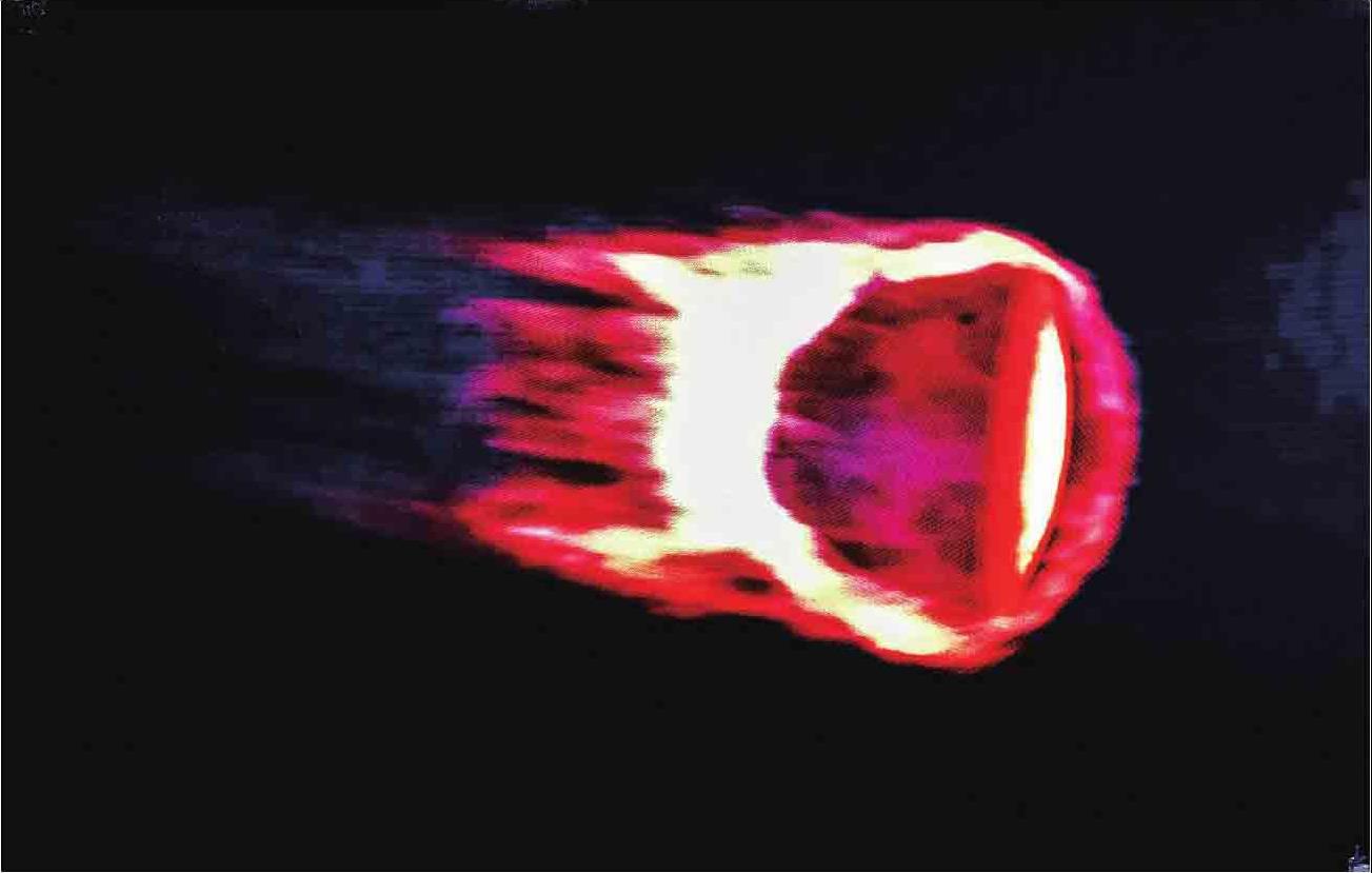 返回舱与大气层发生剧烈摩擦,舱体外部燃起高温火焰,像是一团火球