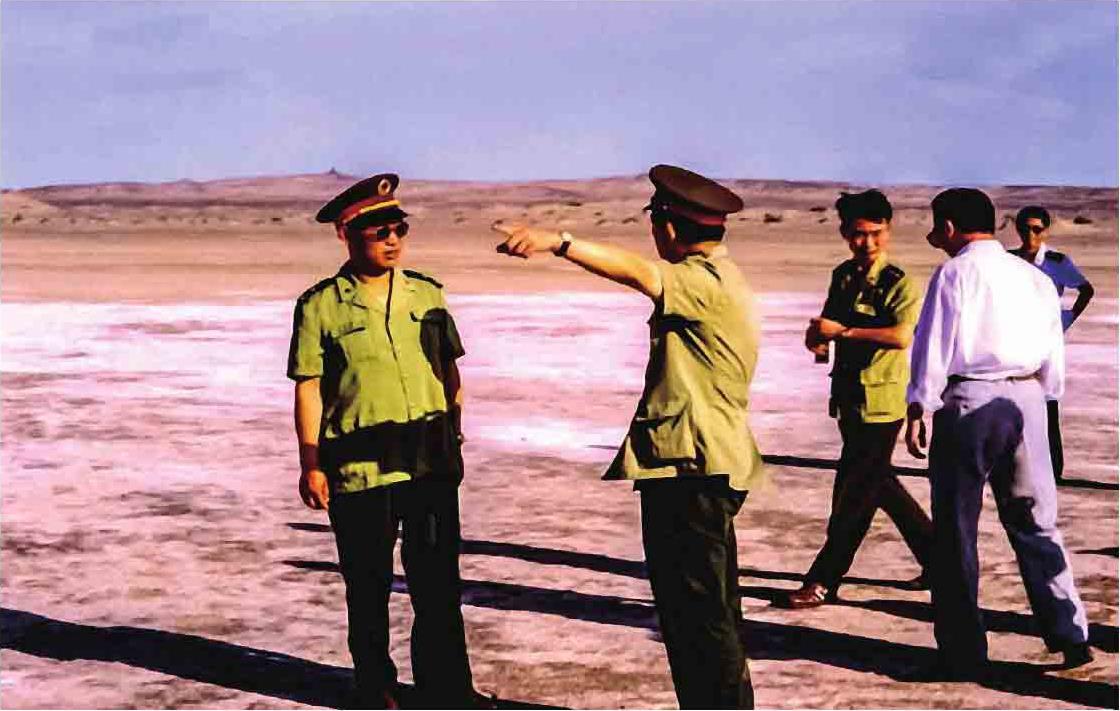 1999年7月,东风航天城政委鲁思诚(左一)深入干涸十年的居延海考察生态情况