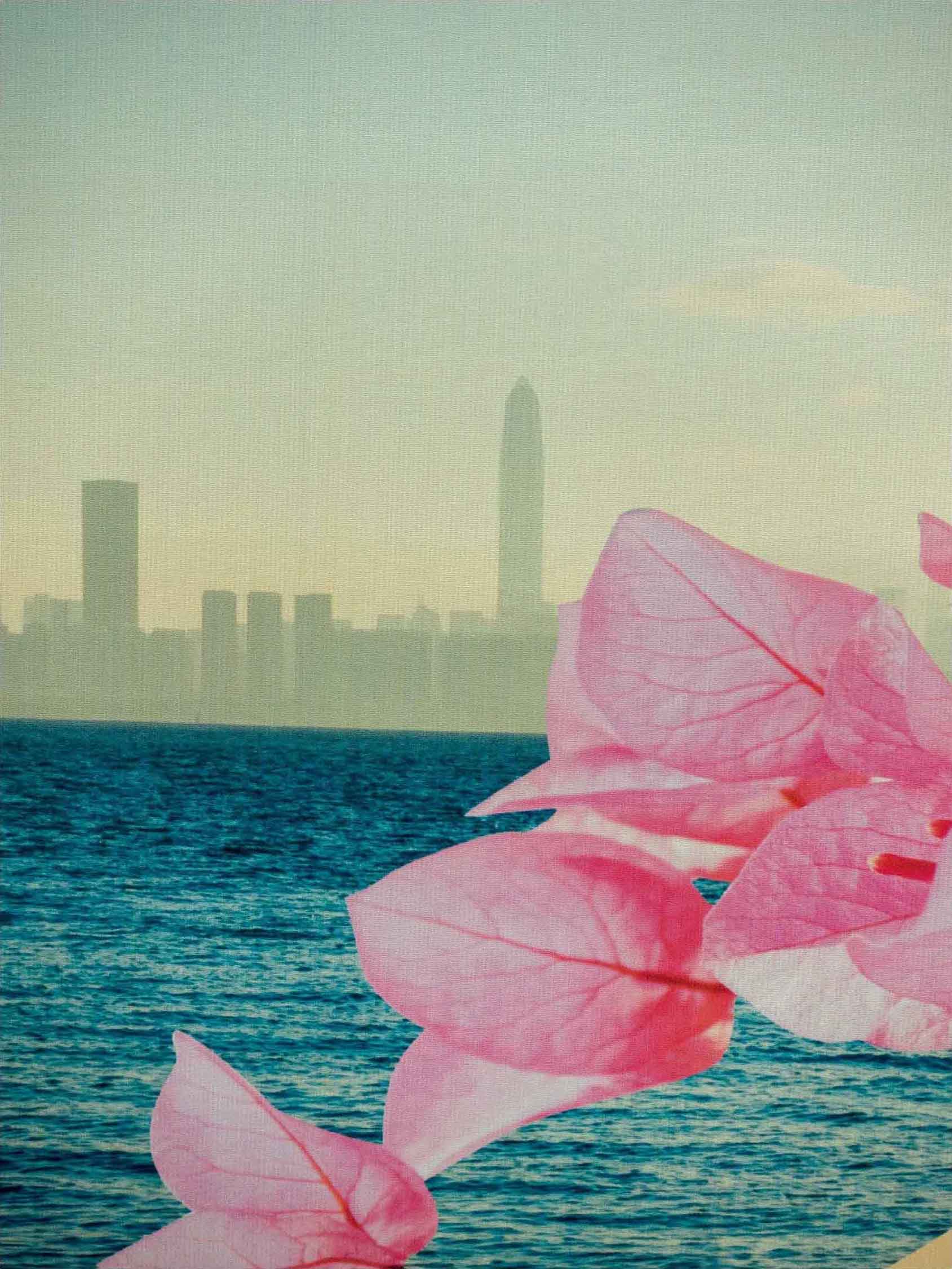 《深圳梦》(深圳第一高楼平安金融中心等城市建筑的剪影出现在街头的广告画中,与深圳市花簕杜鹃以及波光粼粼的海面一起描绘出既真实又梦幻的场景),2017年马格南深圳Live Lab,©克里斯托弗·安德森|马格南图片社(大乾艺术供图)