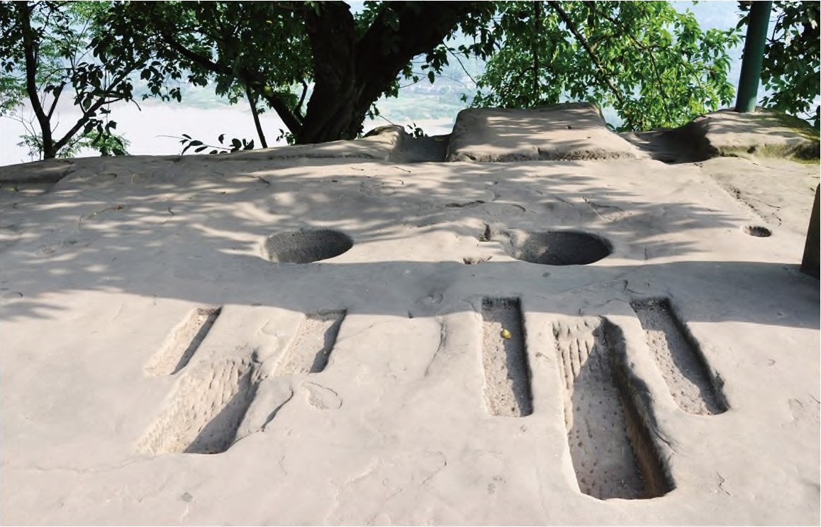 岩顶那像锅一样的圆形凹坑、石槽用于碾制火药,这是我国最早的兵工厂遗址。城中石碾、凹坑是用来加工粮食的遗存,也是被围困的军民自救求生、坚贞不屈的真实写照。
