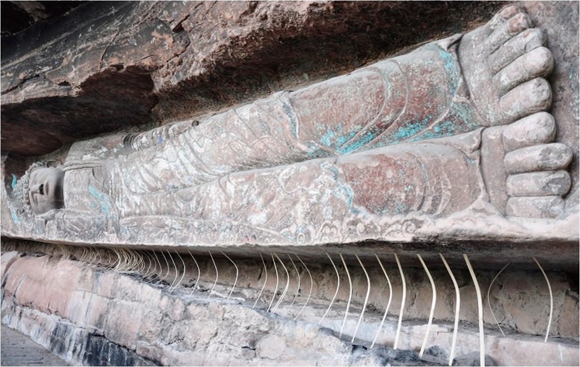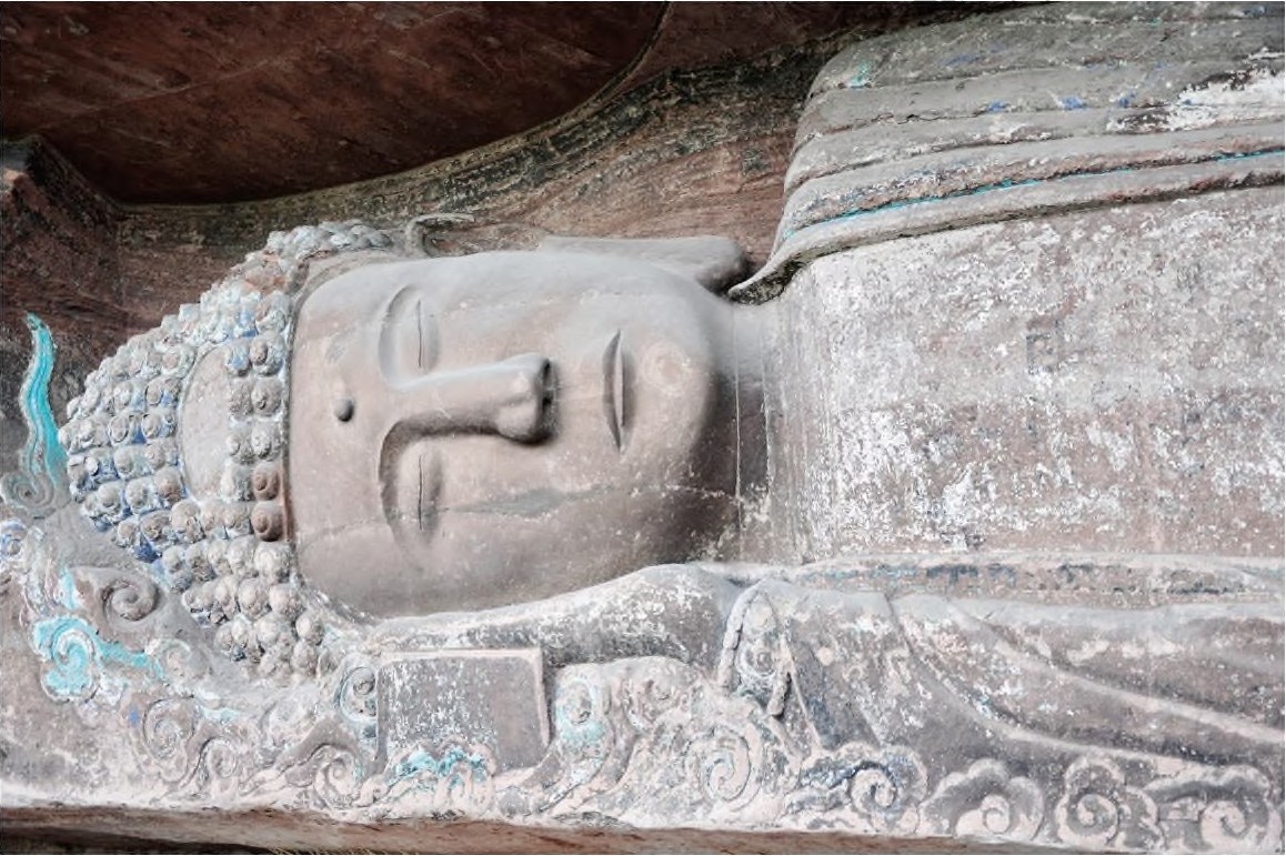 沿崖壁而行,“一守千年”的卧佛凄然悲怆,身下一道贯穿的崖缝令其似悬空而卧。大佛目睹了钓鱼城保卫战的日日夜夜,兵败后闭上了双眼,却依然守护着古城。