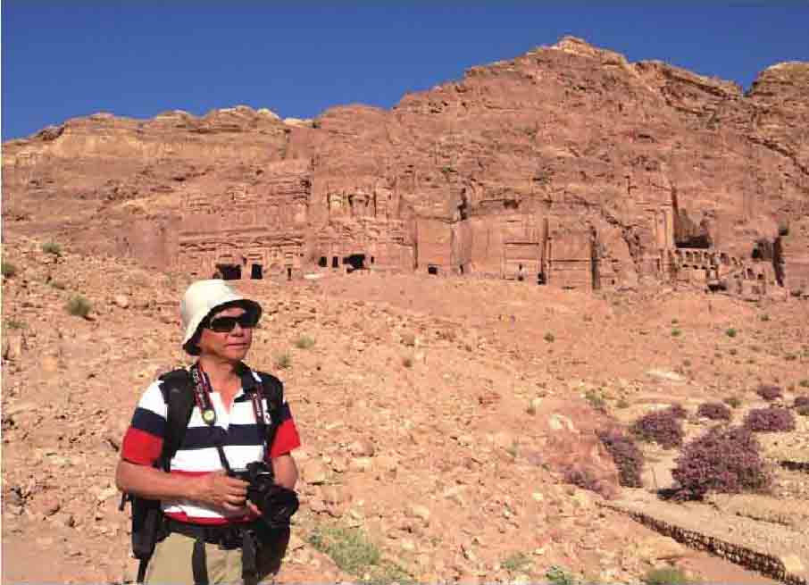 作者在佩特拉古城崖壁前留影