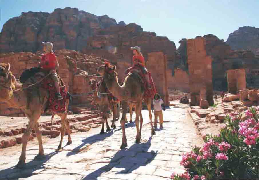 佩特拉古城位于安曼南250千米处,隐藏在阿拉伯谷东侧的一条狭窄的峡谷内,通常被认为是纳巴特王国的首都,到底是什么时候建造的尚无定论。根据其陵墓半埃及半希腊的样式推测建于公元前6世纪之后,因其在褐色砂岩高山上开凿而成,故素有“玫瑰城”之称。