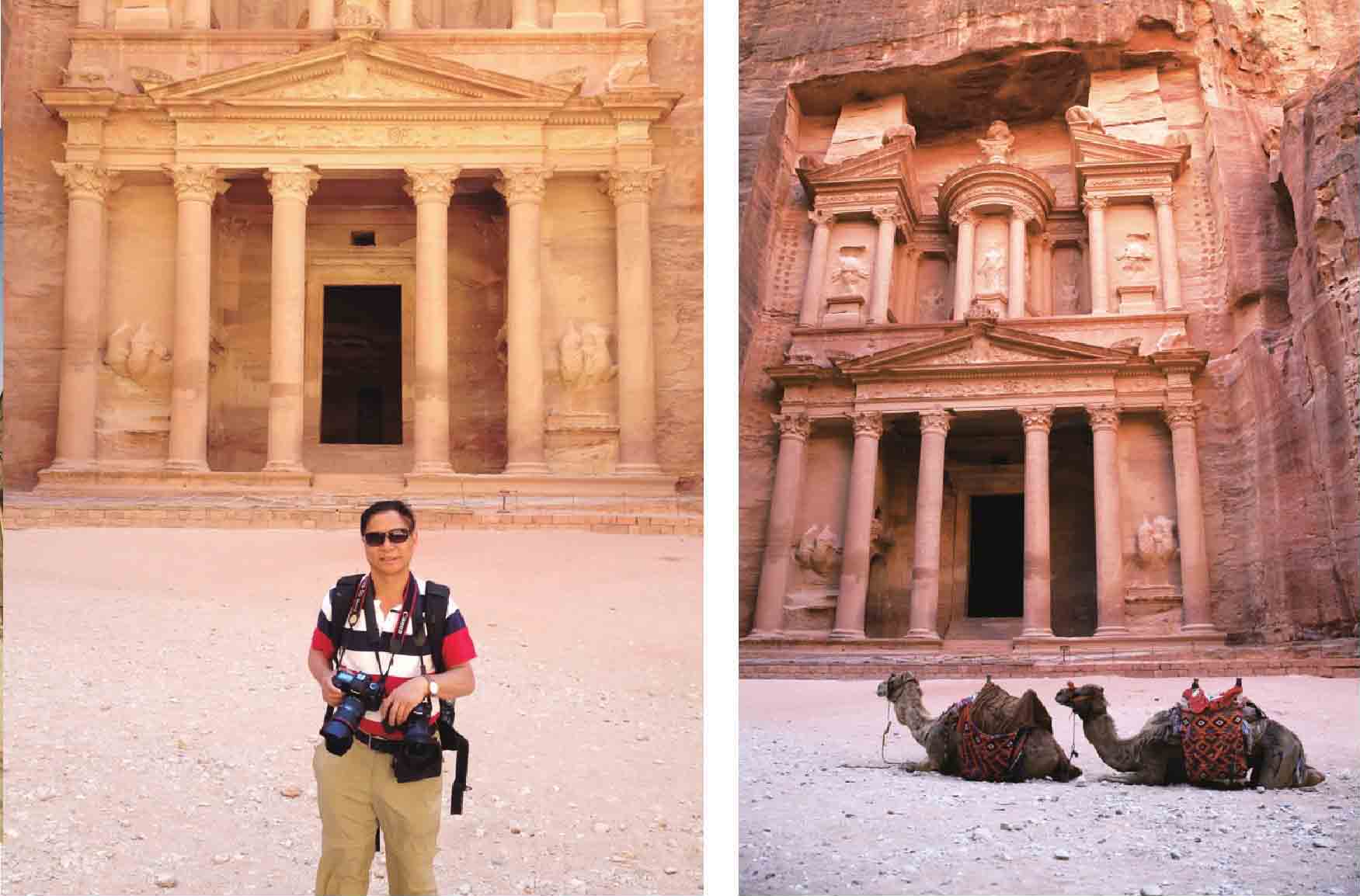 佩特拉古城的哈兹纳赫殿堂圣殿门(上左图为作者在此门前留影,上右图为此门全貌)