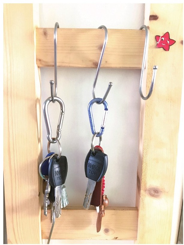 墙面用多出来的木框做了一个架子,挂上几个S钩,用来挂钥匙。