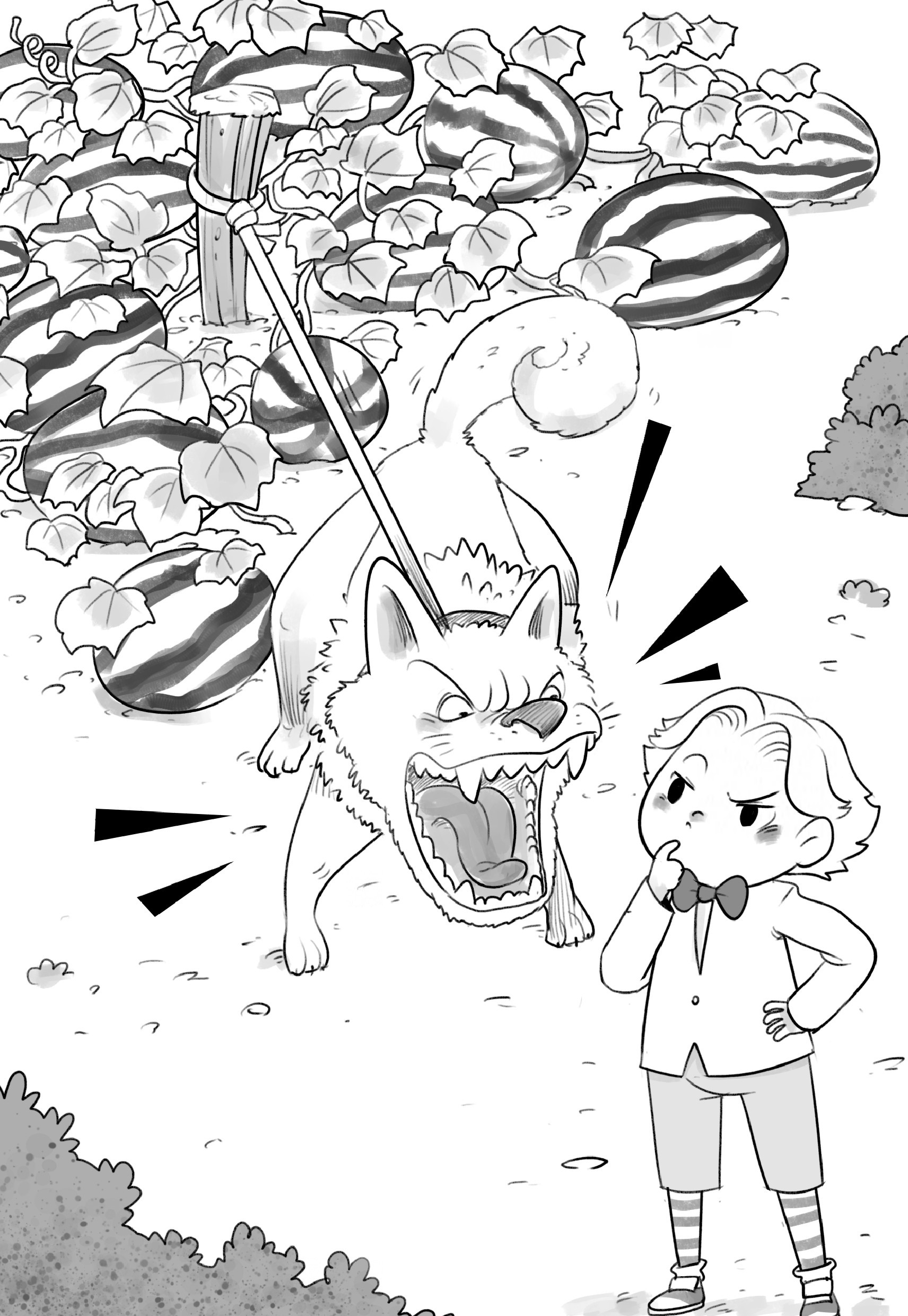 梅莉婶婶说得没错,只见方形的瓜地中央,拴着一只可怕的大狼狗。贝瑞克距离瓜地还有十几米远,“汪汪汪……”它便龇牙咧嘴地狂吠起来,吓得贝瑞克连连后退。