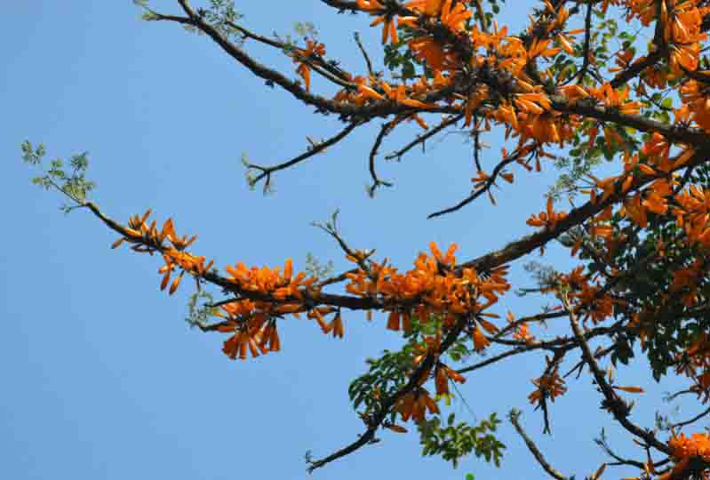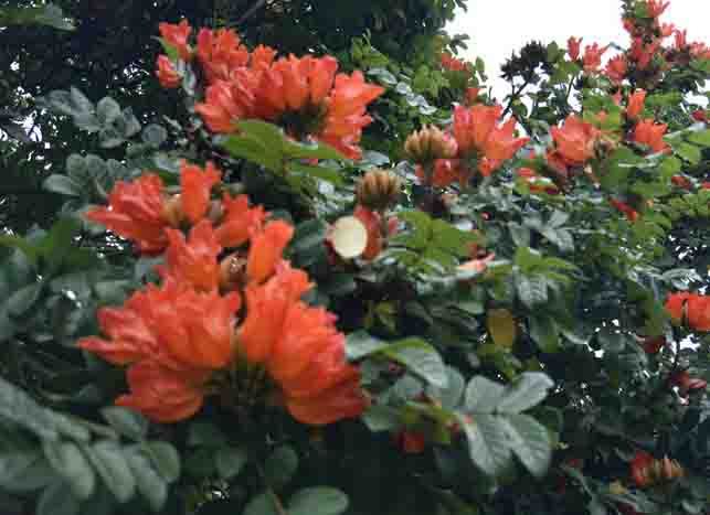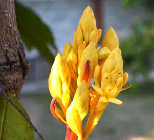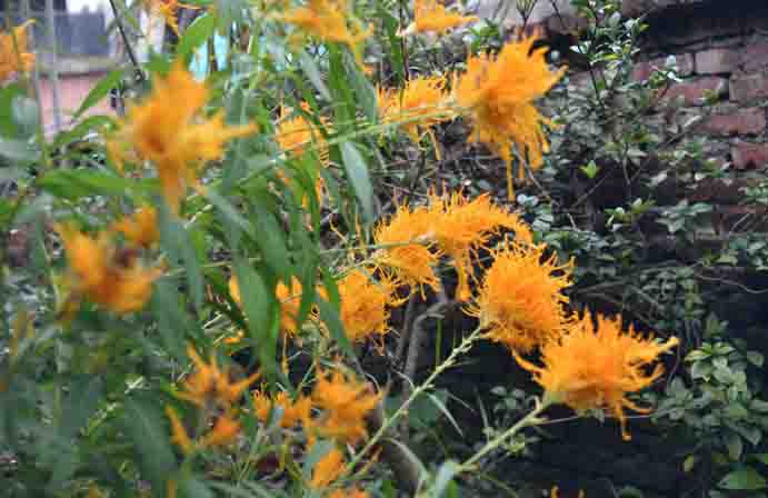 长长的沟边,有花树一字排开,树高4~5米,成串的金黄色花球坠在枝叶间。更大一些的,则一个个悬挂在枝干下面,把绿色的枝叶印染成满树的金黄,招惹着蜜蜂来此采蜜。这就是无忧花。无忧花,又名“火焰花”,为常绿乔木,枝叶浓密,花苞硕大,远望如团团火焰。关于无忧花,在南传佛教盛传地区有一个传说。在两千多年前的古印度,有个叫迦毗罗卫的王国,国王和王后结婚多年也无子嗣。王后45岁那年,梦见一头白象从空中飞来钻入自己腹中,之后王后便怀孕了。按照古印度习俗,女子怀孕的头胎,需到娘家生产。即将临盆前,王后乘坐着大象轿子回了娘家。路过兰毗尼花园时,她觉得有些不舒服,就停在一棵无忧花树下休息,即在树下产下了一个男婴。这男婴就是后来的释迦牟尼佛祖。于是人们把无忧花树视为圣树,广泛种植于房前屋后和寺庙的庭院之中。一些没有儿女的家庭,也会在自己家的院子里种上无忧花。无忧花花期在每年的4~6月,其树皮可治风湿和月经过多等疾病。