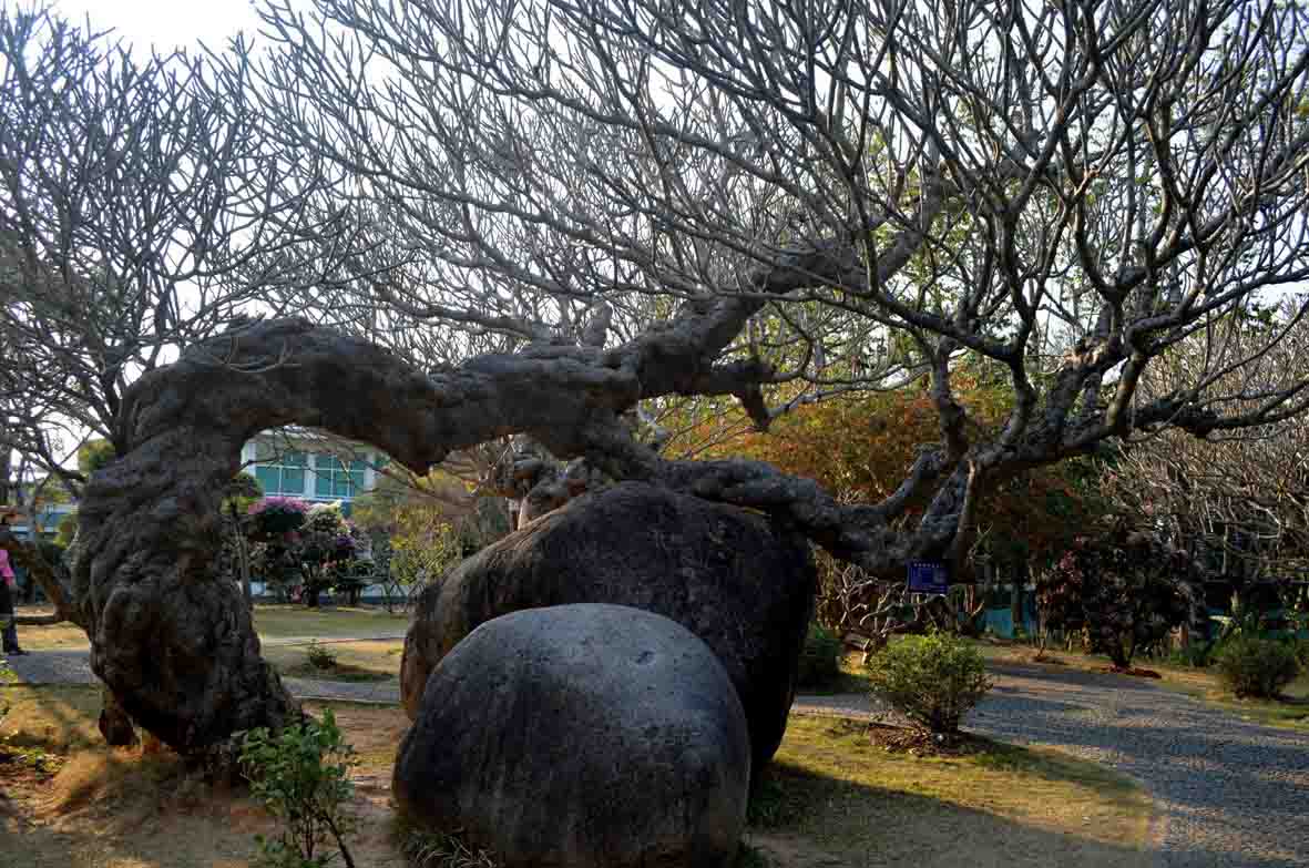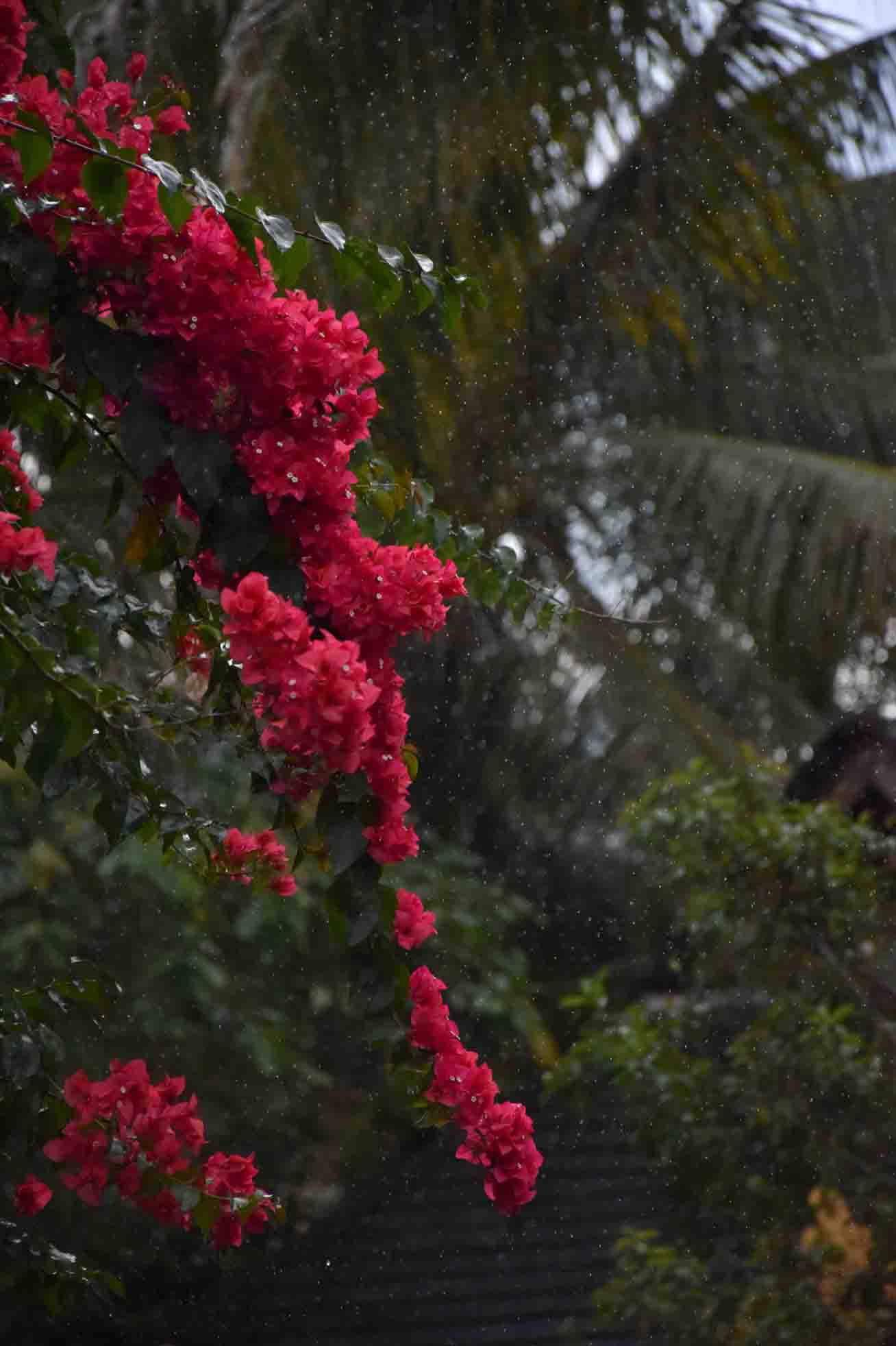 清晨,在园区的远处,升腾着一个个硕大的彩色花团,如稠密的晨雾匍匐于园林之中,那就是三角梅园。三角梅也叫“叶子花”,是紫茉莉科植物,原产于南美洲地区,本属有18种。现已有绿叶水红、绿叶大红、金边大红、重瓣大红等30多个品种在百草园终年争奇斗艳,异彩纷呈。叶子花最鲜艳的部分不是花,而是苞片,里面的小白点才是真正的花,鲜艳的苞片是用来招蜂引蝶的。在西双版纳,三角梅常年都会开放,花期也很长。在三角梅园区,最博人眼球的景点是由各色三角梅搭建的那条花廊。进入花廊,似梦幻仙境的错觉。这是人们喜爱的摄影打卡地,也是新婚夫妇们拍结婚纪念照的理想场所,各色鲜花、绚丽的自然环境装点了他们的新婚照,也是送给新人们的最好祝福。