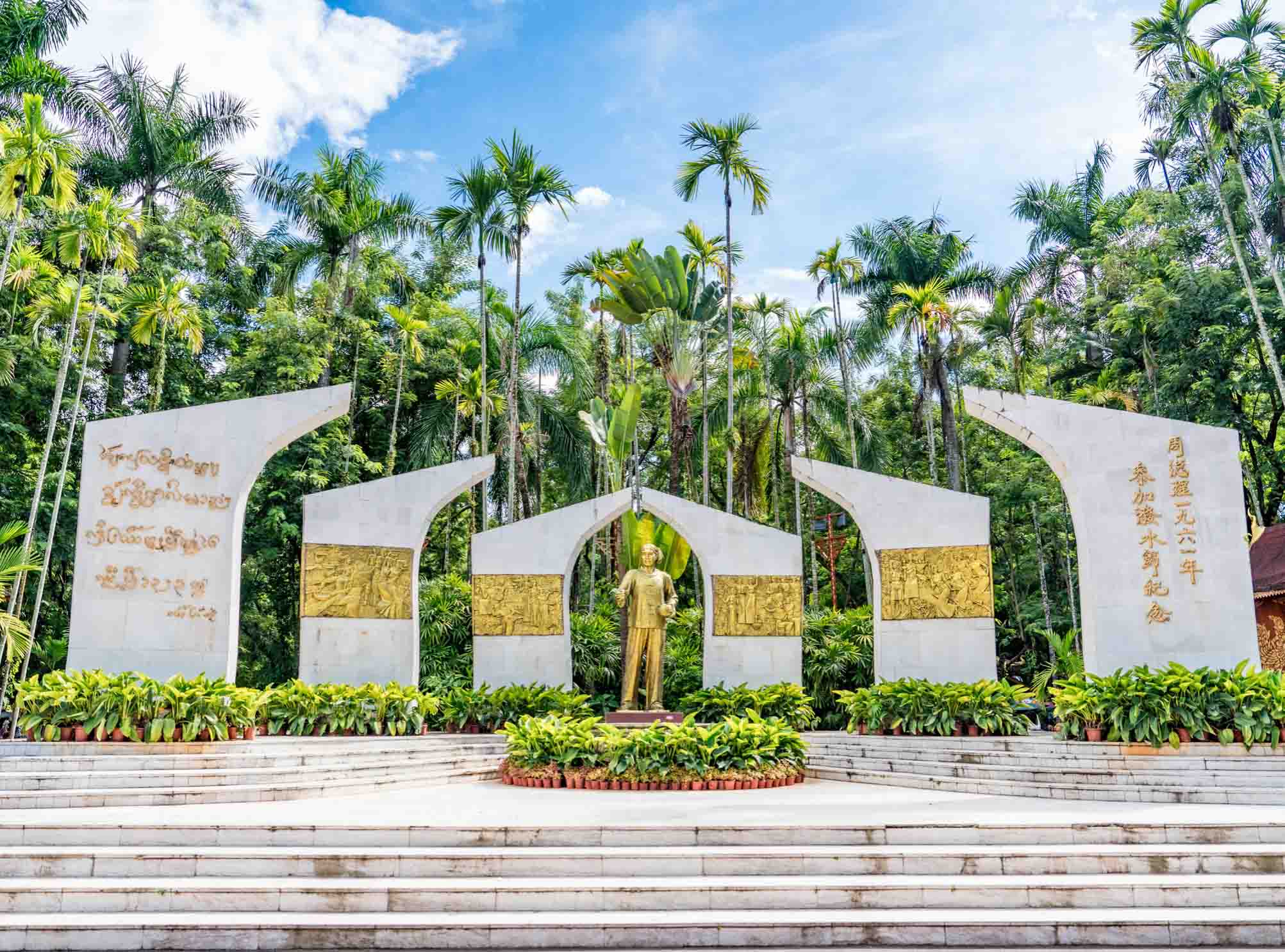 “火红火红的凤凰花开了,傣族人民一年一度的泼水节又到了。1961年的泼水节,傣族人民特别高兴,因为敬爱的周恩来总理和他们一起过泼水节。” 想必大家都对这些温情的文字依旧印象深刻。这是小学语文课本里《难忘的泼水节》中的一段文字。而位于公园大门最前端的一处景点,正是对这段文字的生动写照,那就是“周恩来总理参加傣家泼水节纪念碑”。1991年,为纪念周恩来总理来西双版纳参加傣族新年泼水节30周年,西双版纳州政府在曼听公园建此纪念碑。主碑高4.5米的周总理全身铜像,耸立在圆形基座上。铜像两侧6块5米高的汉白玉围屏,像一朵吉祥、圣洁、美丽的白莲花紧紧围绕着总理像。围屏上雕刻的铜质民族浮雕图案,生动还原了当时各族人民敲锣打鼓、载歌载舞迎接总理的盛况,象征着西双版纳各族人民对周总理的爱戴与敬仰。