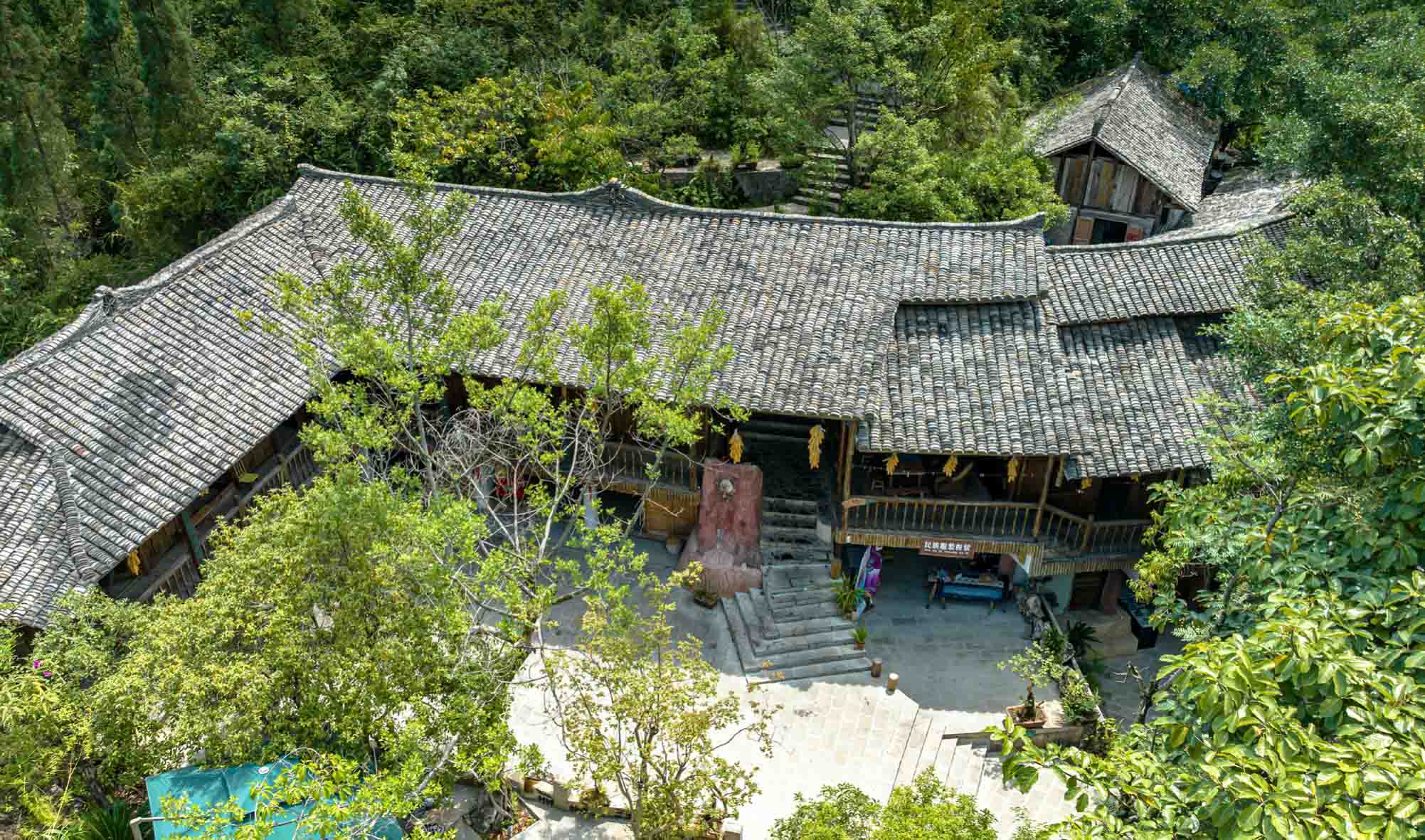 万峰第一观上布依第一家,翠筋竹摇曳的枝叶间隙,人文揉搓进风光,音律轻轻回荡,自然而舒缓。吊脚楼下,牛皮刺鼓轻敲;楼上廊道,悬挂着的大蒜辣椒串旁,麻绳吊了竹竿,绕垂下的土布,迎风悠扬。大榕树下,山里人家。