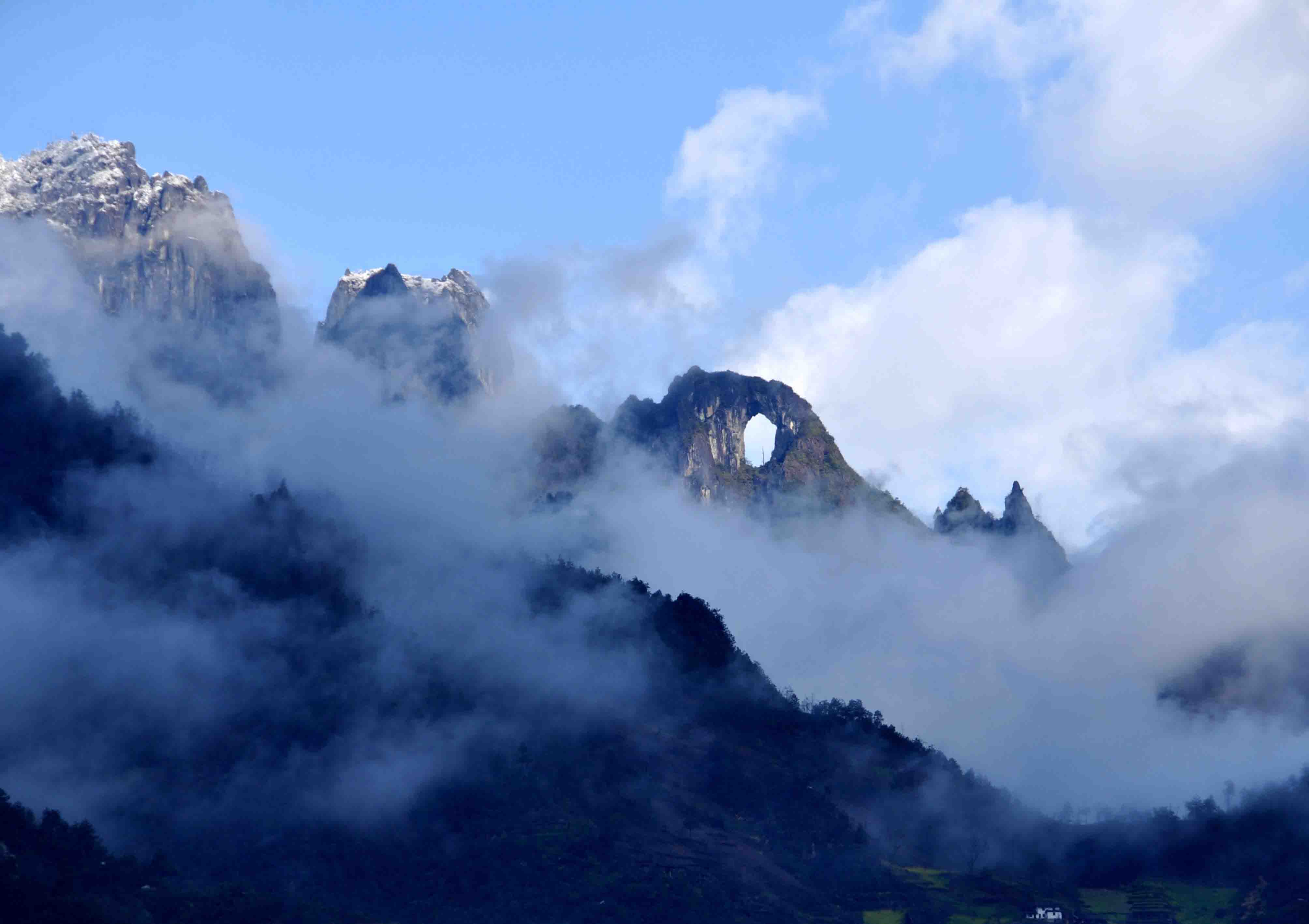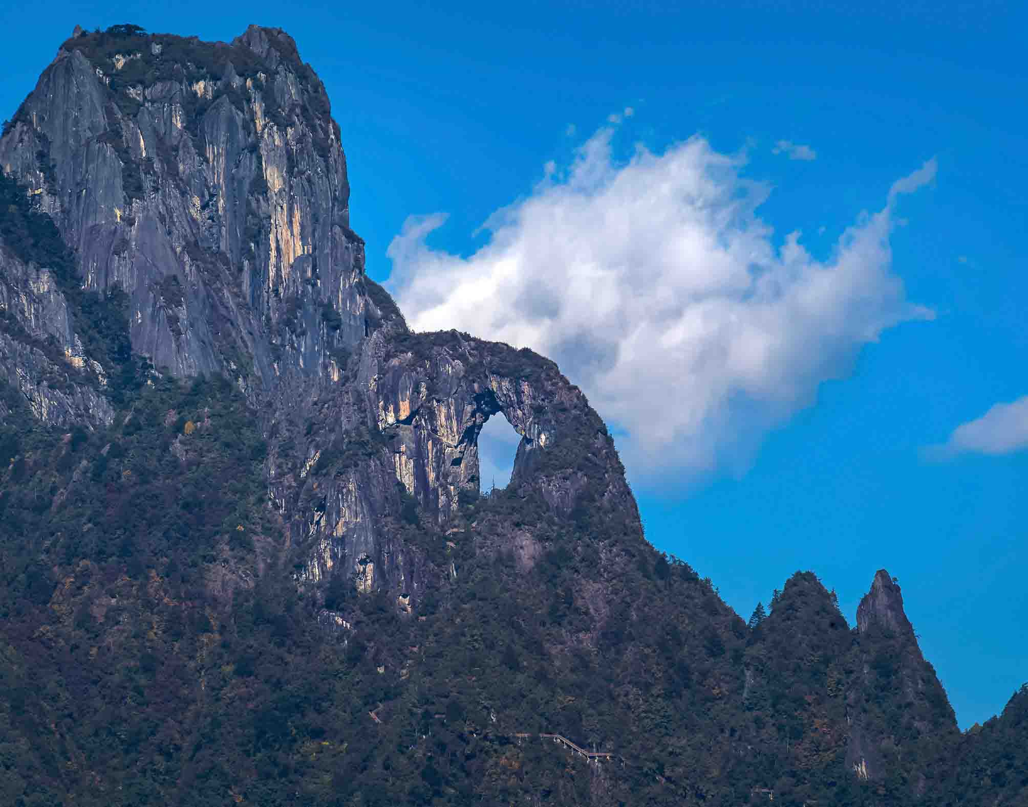 咆哮的怒水,险峻的山崖,耸立的群峰,把石月亮衬托在天地之间,与日月同辉、与山河万古。天上的月亮有阴晴圆缺、有夜升昼落;石月亮始终圆满、昼夜常伴,弥补了阴缺降落的缺憾。雾气蒸腾的早上或雨后初晴时,薄雾漫笼,石月羞羞答答地时隐时现,与云雾缠绵;烈日当空,石月玉轮,交相辉映;月圆之夜,月华如水,石月悠深。