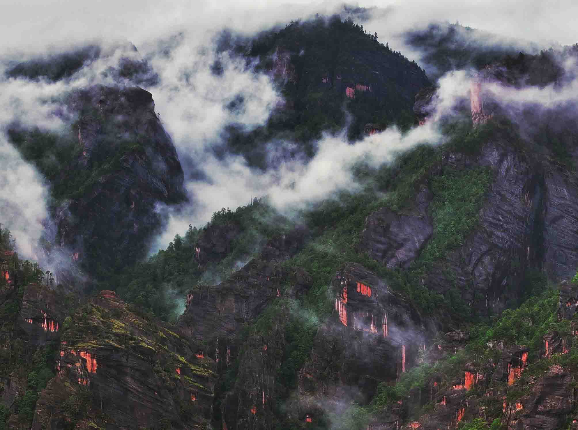 再往深处走,便走进一片丹霞映天的景区了。在普米族世代生息的地方旅游,要事先懂得这些带有民族语言的景点名称的含义。游罗古箐,首先到达的地方是吉利吉峡谷。“吉利吉”在普米语里是悬崖峭壁的意思。吉利吉彩屏为一巨型红岩峰岩,由红色砂岩构成,质地坚硬,峭壁如削,从海拔2800米处隆起,高逾3000米,雄踞箐首,巍峨竦峙,站在峰顶目及几千米外的青青牧场茫茫原野,能看见草地簇簇羊群和村寨袅袅炊烟,令人顿生乡村田园情趣。绝壁之下是七彩溪流迂回百转在丛林间,静静聆听,可闻潺潺流水声;注目凝视,可见溪中游弋的鱼儿。站在峰巅,会让你感觉到自己离苍穹很近、很近,仿佛感受到上苍呼吸的气息,自己也成为神仙而飘飘然,忘记人间一切艰辛和痛苦而周身释然;置身密林,会让你感觉到自己已经成为大自然的一分子,与木树、与岩石、与溪流不分彼此,沉浸于无尽的遐想之中。