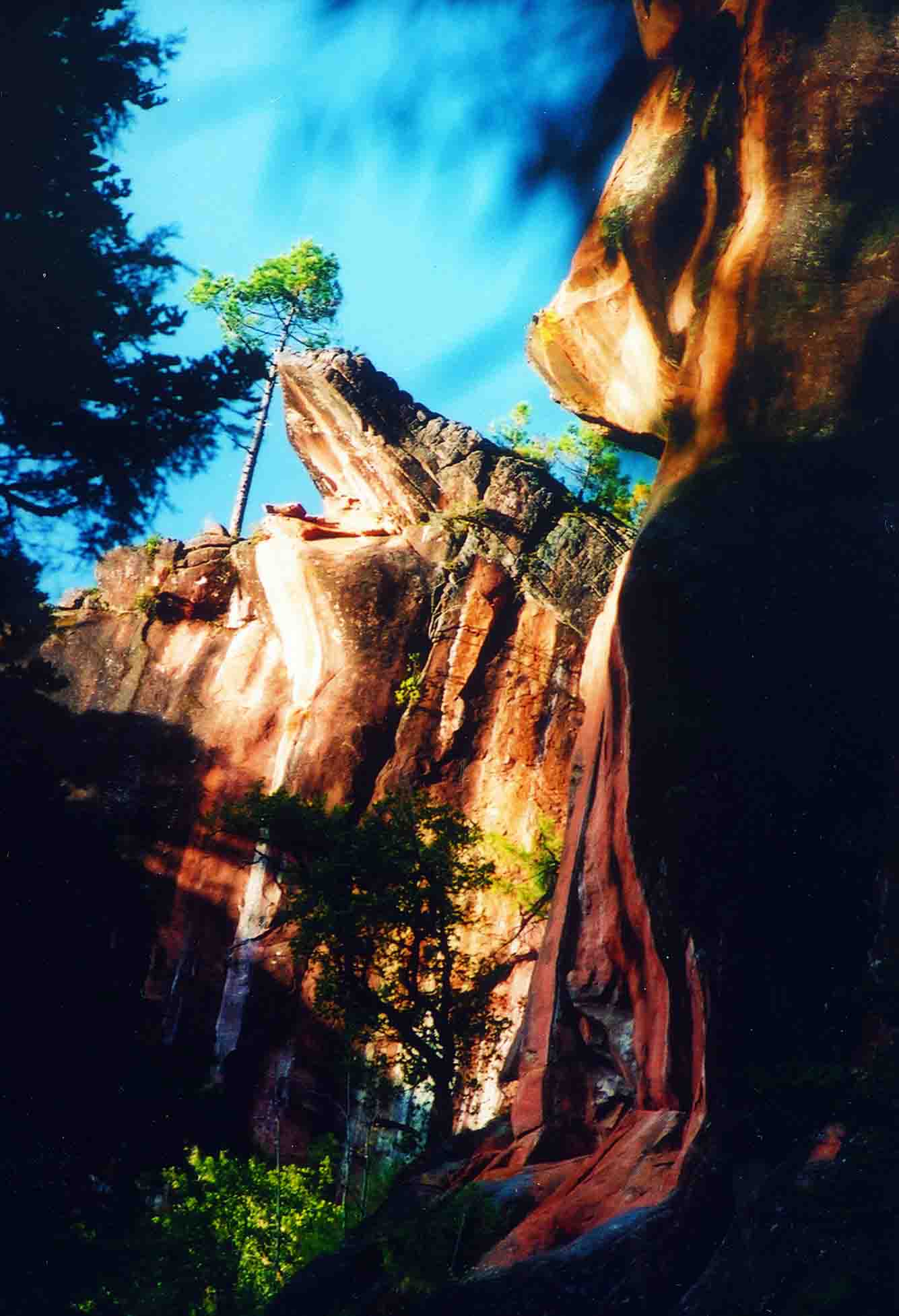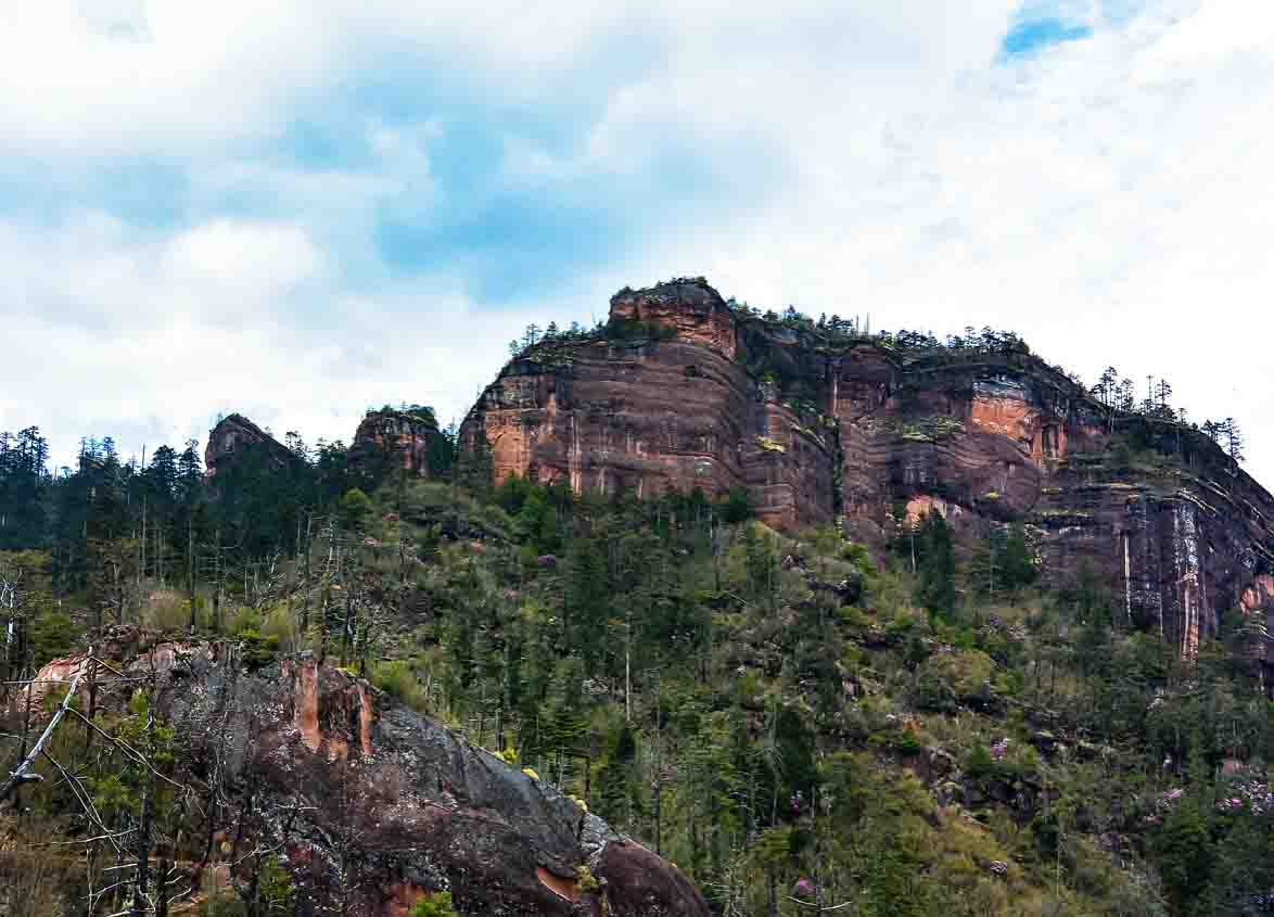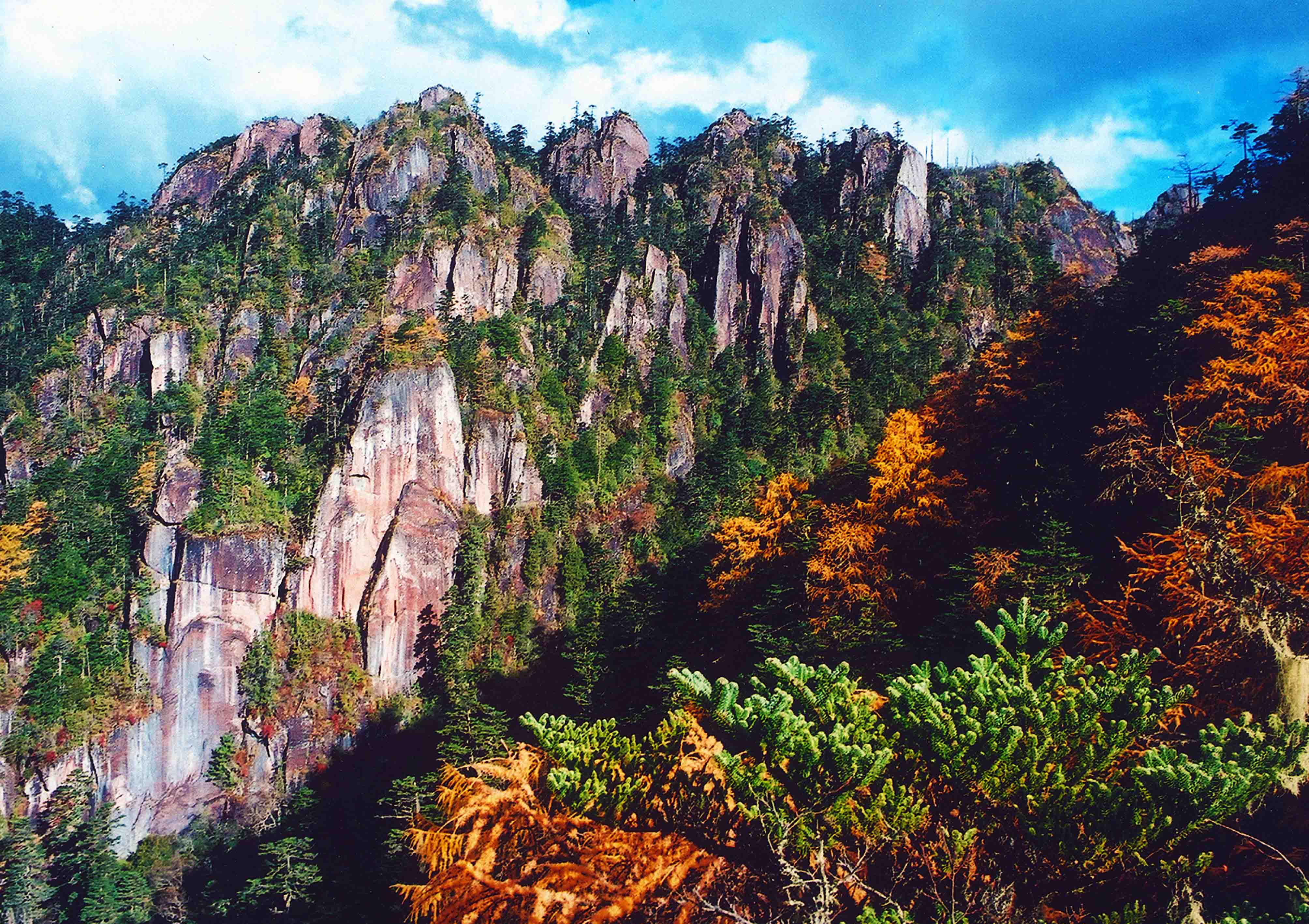 绕过回音壁登上平缓的岩坡,这里的海拔更高,山谷更舒缓。豁然间,眼前出现三座红岩峰丘,峰赤胜丹,状如朱衣红颜寿星。传说,人们只要能攀越这地方,与朱衣红颜寿星接触,就会返老还童,因此被人们称为“三叟峰”。从三叟峰再往高处走,便可到达海拔3300米的山岭。这里的地貌有别于其他地方,郁郁葱葱的森林里,随处矗立的丹霞地貌奇观和原始森林奇景尽收眼底。有岩石表面被风化成神秘美丽的龟板纹,这地方叫“河图岭”;有深溪幽峡,树木浓密,悬崖峭壁对峙两边,这地方叫“一线天”。秋冬季节到此一游,唯见枫叶泛红、杉叶翠绿、桦叶枯黄,层次分明。远处,山岭层峦叠嶂、远近错落有致。一条林中小径弯弯曲曲、飘飘浮浮延伸,走在这样的林中幽径观赏美景,不得不感慨:人比大自然渺小了许多。