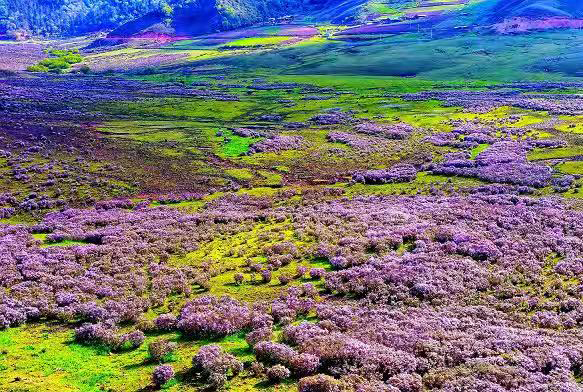 大羊场位于罗古箐北10千米,海拔3100米,面积约6平方千米。走进大羊场,就犹如走进茫茫草原一般令人释怀。四周环山的大羊场草甸上水草茵茵,被弯弯曲曲的小溪分割成数块大小不一的草地,清沟流滢,绿草如织,百花盛开。站在山坡上俯瞰,蜿蜒小溪犹如“天书”一般描绘于大地之上,人们惊叹于它的独特,折服于它的离奇。大羊场四周是开满杜鹃花的缓坡地带,像镶满红、蓝、紫、白各色杜鹃花的地毯向着山坡铺展开去,花海姹紫嫣红,令人目不暇接。徜徉在杜鹃花海,令人心旷神怡,飘飘欲仙。除了杜鹃花,龙胆草娇嫩欲滴,芽蓼楚楚动人,马先蒿婀娜多姿,剪股颖妩媚多情,问荆顾盼生辉,仙姝星目传情,羊草含羞带怯……就连那匐地而生、附物而长的苔藓也不甘寂寞,悄悄地绽出一星星花朵,默默地捧出一粒粒果实,展示着自己的风采,奉送着自己的情怀。