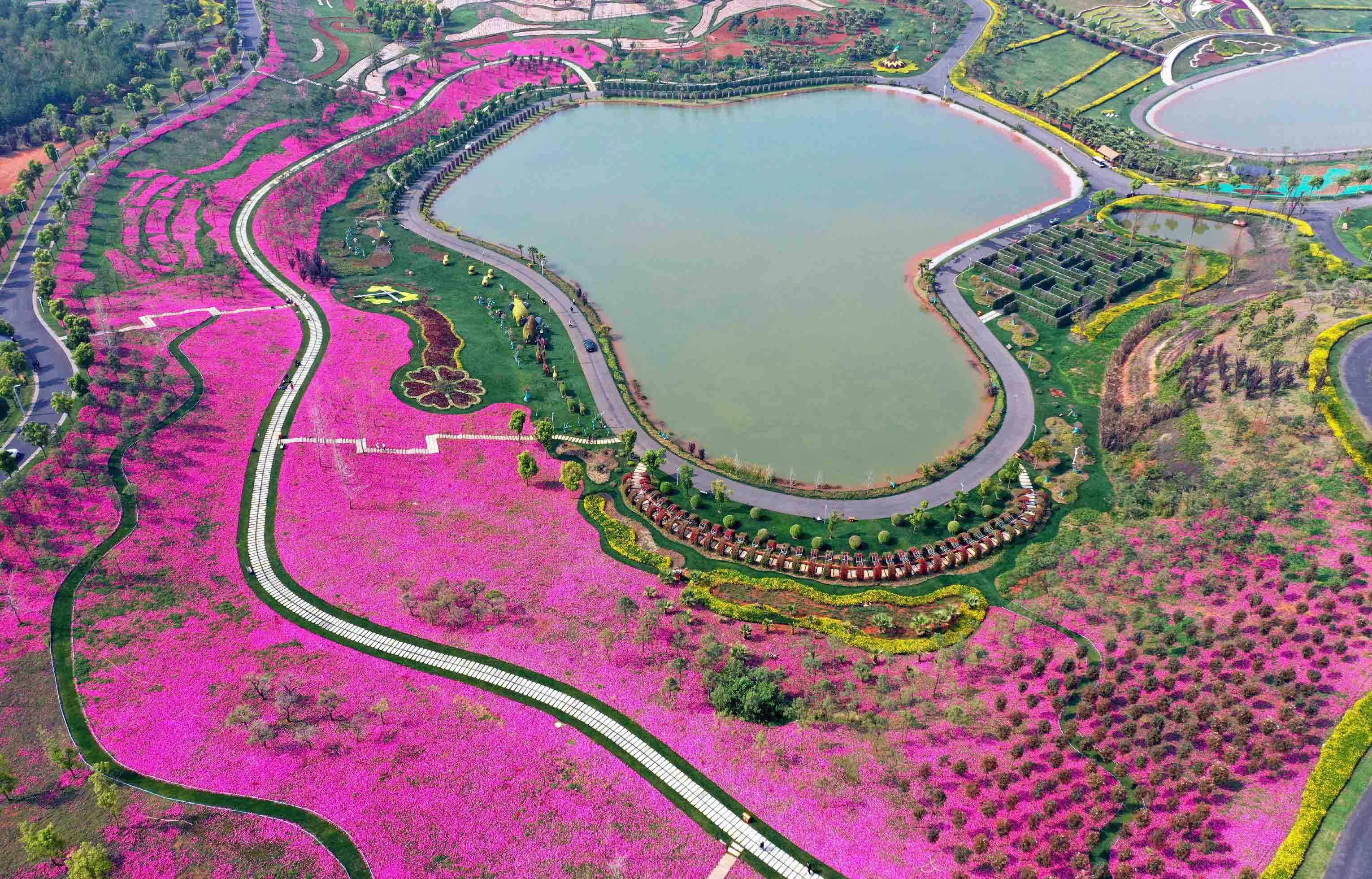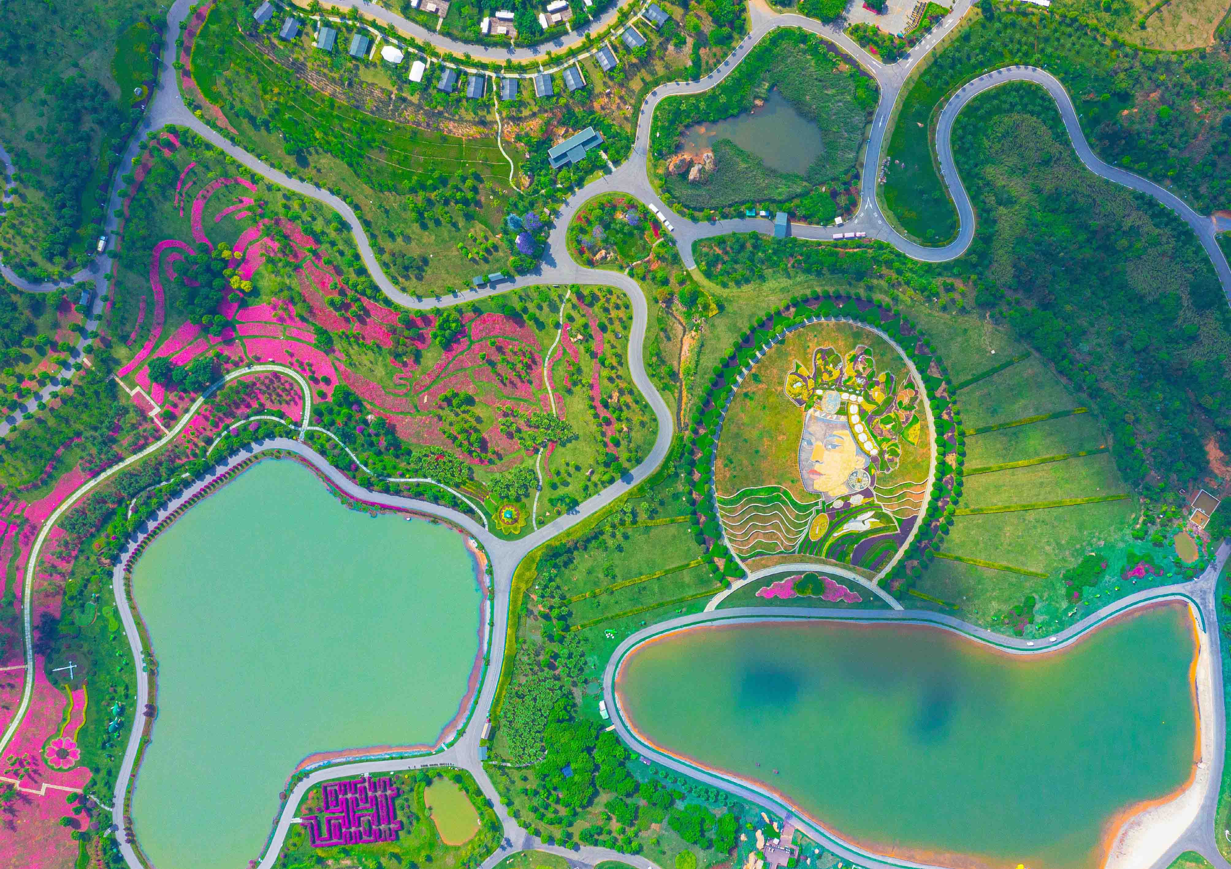 每一个到太平湖的游人,几乎都会走上观景台,像看初恋一般,久久注目那幅铺展于一片斜坡上,用鲜花构建的巨幅大地画作——《太平公主》,很多游人会久久地凝视着“太平公主”那张美丽端庄、若有所思而又略显忧郁的面容,这让“太平公主”正前方另一座山坡上的观景台总是人满为患。这幅由国际大地艺术家斯坦·赫德先生在亚洲首秀的大地艺术作品,占地约33000平方米,可以四季常艳,为永久性画作,它可以从环绕景区的三面不同的角度观赏。如果在观景台上观赏这幅作品,以彝族女性传统头饰为原型,添加了斯坦·赫德先生对中国文化中民族元素的理解,包括代表云南的山茶花、代表女性的鸾鸣凤舞。它以自然大地为画布,利用土壤、砖块、植物、岩石和有机覆盖物等构筑,通过色彩和高低的变化形成令人叹为观止的大型画作。
