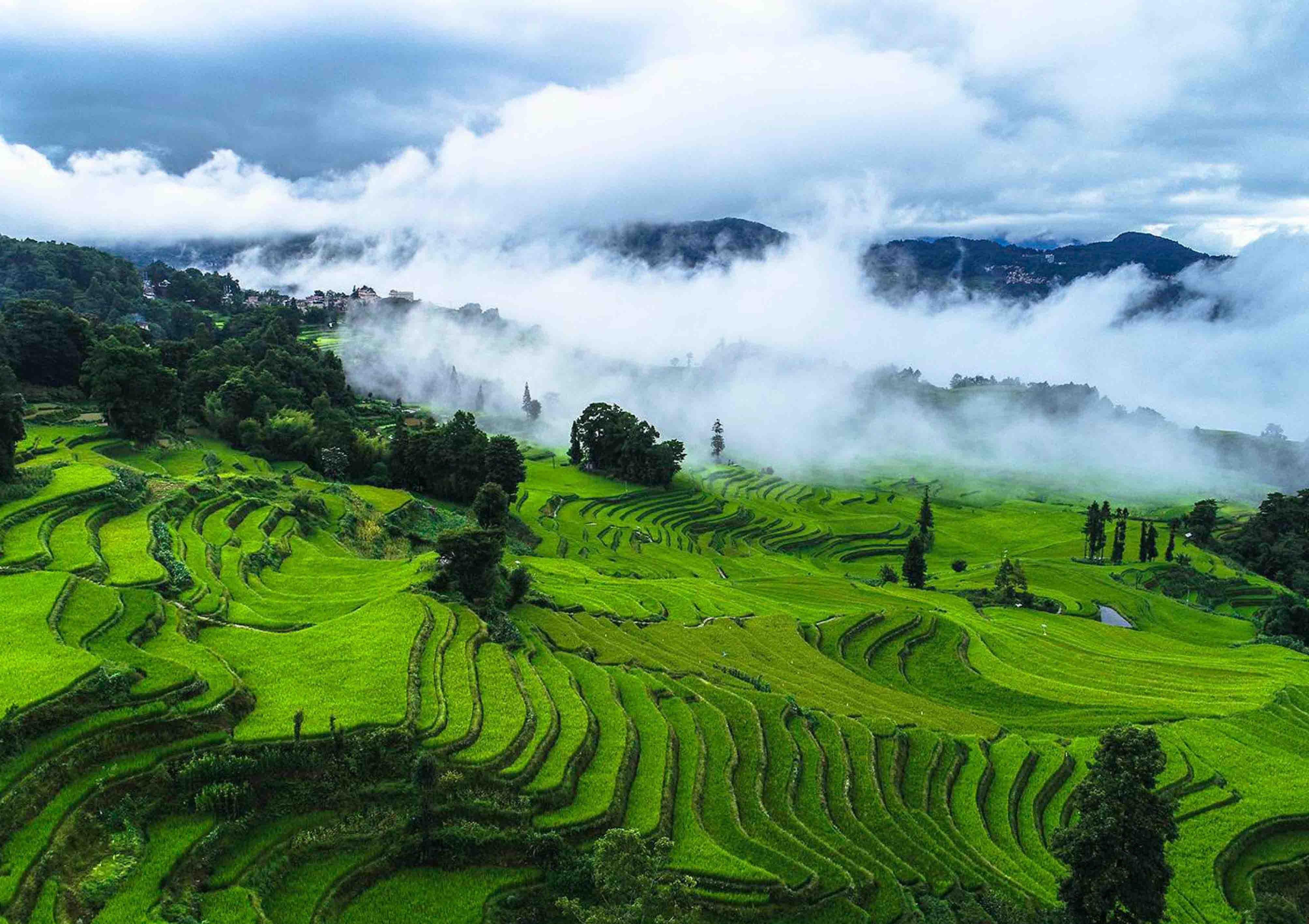 如果你是初夏时节才得以和哈尼梯田相遇,也大可不必遗憾,此时的哈尼梯田,又是另一番美丽景象。秧苗刚栽下,看不到那种波光粼粼的景象,但有秧苗中间透出的田水,映衬出少许白色的云朵。放眼望去,都是一色的碧绿,绿得生机盎然,绿得朝气蓬勃。绿色,生命之色,养眼养心。