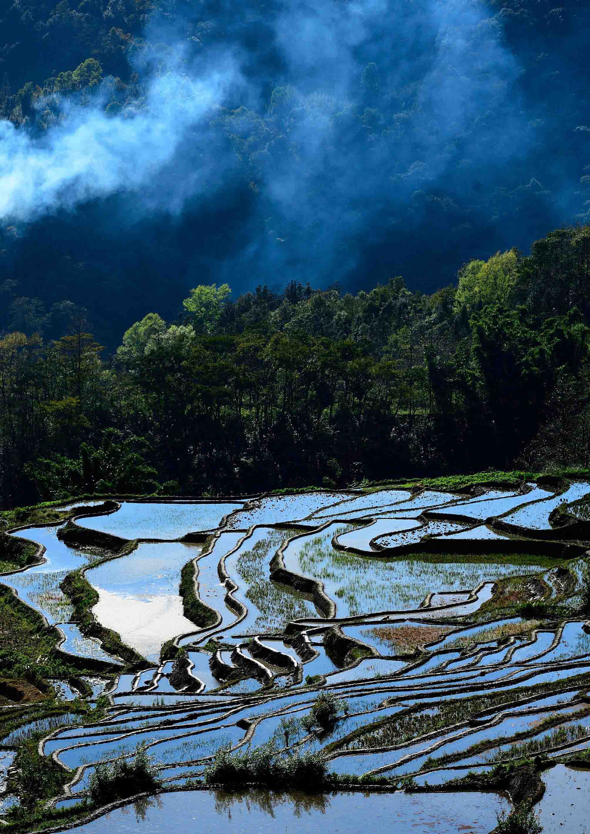 午后的阳光如碎金般撒向大地,连绵山峦上的梯田魔镜般闪耀着让人惊心动魄的光。老虎嘴约4平方千米连片的梯田,大的一块数千平方米,小的一块如桌面;少则一坡上百级,多则一山上千级……流连梯田间,蜿蜒的田埂让人辨不清东西南北,清澈的水中有鱼儿在游来游去。极目远眺,山顶上有茂密的森林,森林下是一片一片独具特色的哈尼族“蘑菇房”,那便是哈尼山寨。山寨中不时隐隐约约有鸡鸣狗叫声和着孩子们银铃般的笑声传来,山寨的下面就是梯田,在山谷的谷底,有河流静静流淌……很多看过哈尼梯田的人脑海中会有一个又一个的疑问:为什么梯田的上方没有水库,也没有大江大河,而梯田里却有水?地处偏僻的哈尼人,又是凭着怎样的意志、智慧和力量,开垦出养育了世世代代哈尼人的如此壮观的梯田?他们又是怎样实现了人与自然的和谐相处?去看过多次梯田后我才明白,哀牢山顶的茂密森林是水的源泉。由于红河哈尼族居住的地方多为海拔较高的山寨,山高坡陡,山脚为河谷,立体气候明显,河谷干热的气候使江河水大量蒸发,在蒸发的过程中遇山顶的冷空气后形成云雾,继而凝聚成雨水,倾泻下来,滋养了亘古以来的广袤森林。又由于森林巨大的贮水作用,使得这些降雨在高山森林中形成无数溪流、泉瀑、龙潭、池塘,无数溪泉沿着千沟万箐潺潺而下,滋润了梯田。通过森林、村寨、梯田、江河四循环,构筑、滋润了哈尼梯田,也孕育了深厚的哈尼梯田文化。而半山区云雾升腾沉降形成随处可见的云蒸霞蔚、变幻莫测的云海奇观,将森林、村寨、梯田掩映覆盖,使人赏心悦目,美不胜收。