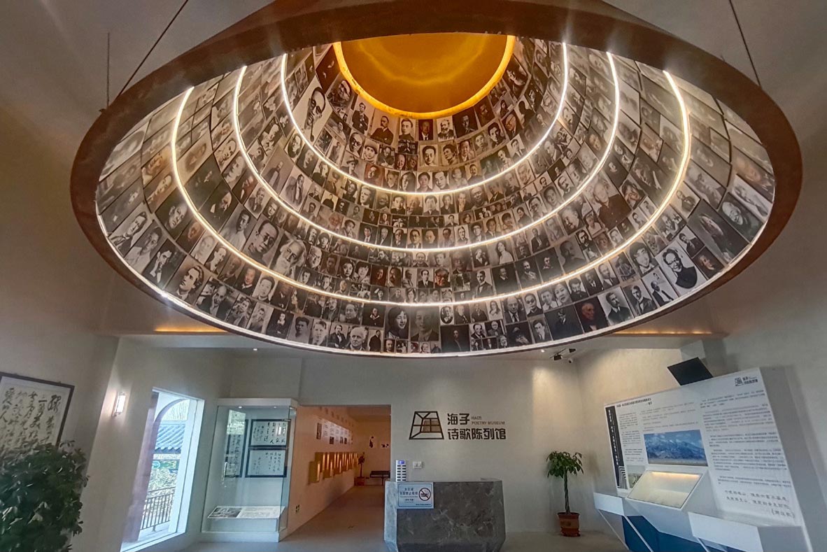 陈列馆布局颇具匠心,既有平面的资料展示,也有影音立体展示,让游客多维感受一个诗人的魅力,特别是主展厅中心一面由巨大的黑色大理石做成的波浪翻涌的大海设计,契合了“面朝大海,春暖花开”的意境,还有悬空的诗人头像组成的螺旋式影像吊灯,也别开生面。