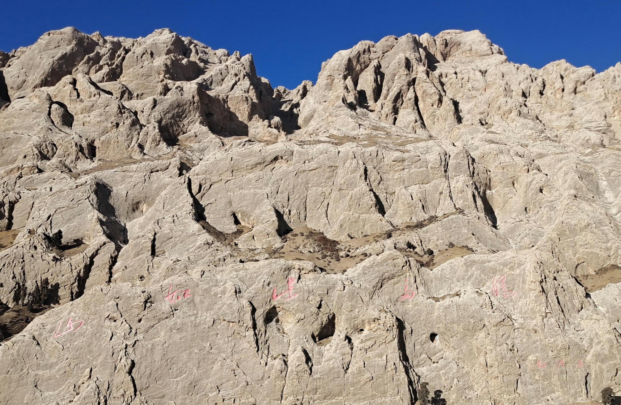 往对面大山一堵巨大的裸岩上细看,终于看见巨岩上有巨大的石刻,只因为风吹日晒,石刻鲜红的油漆有些脱色,但也看得出那几个线条飞扬、气势磅礴的毛体大字:江山如此多娇!