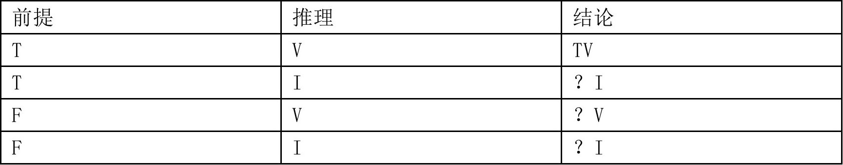 “字母‘T’是True的第一个字母,我们用它代表‘真’;‘F’是False的第一个字母,我们用它代表‘假’;‘V’是Valid的第一个字母,我们用它代表‘对’;‘I’是Invalid的第一个字母,我们用它代表‘错’。至于问号‘?’呢?它是用来表示‘真假不定’的情形的。我们把这些名词和记号的指谓弄清楚了,就可以学着读这个表。