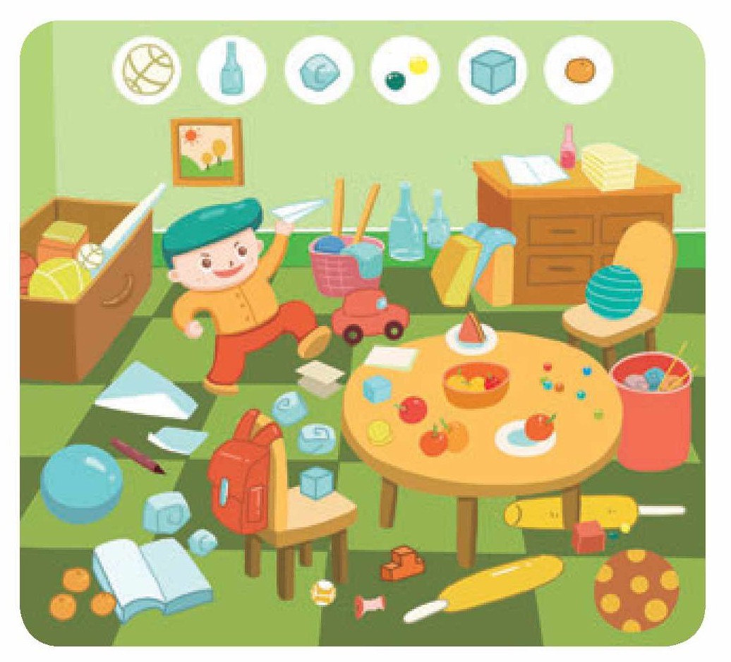 捣蛋鬼的家里真是乱极了,你能试着找出圆圈中列出的这几件物品吗?请用笔圈一圈。