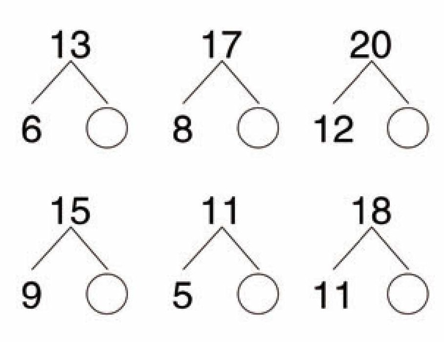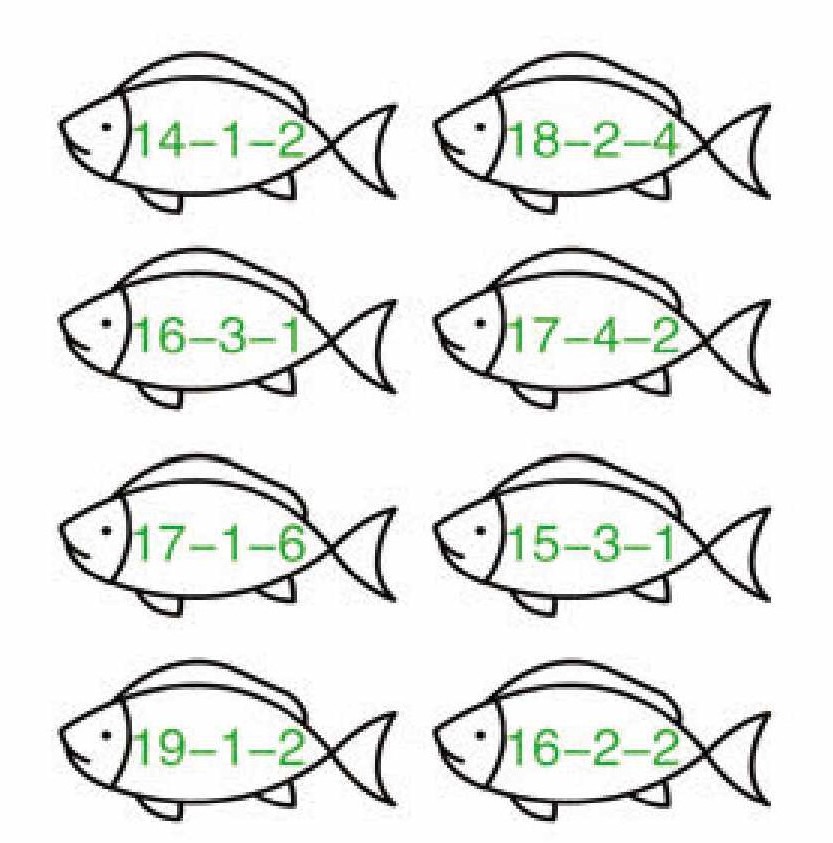 给得数是11的小鱼用红色笔圈出来,给得数是12的小鱼用蓝色笔圈出来。