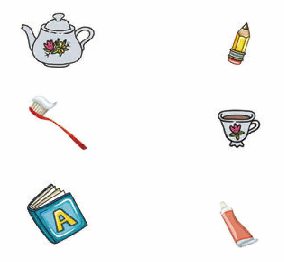 左图中每张卡片上的3件物品为一组,请你快速记下来,然后遮住,再将右图中的所有物品也分成同样的组吧!