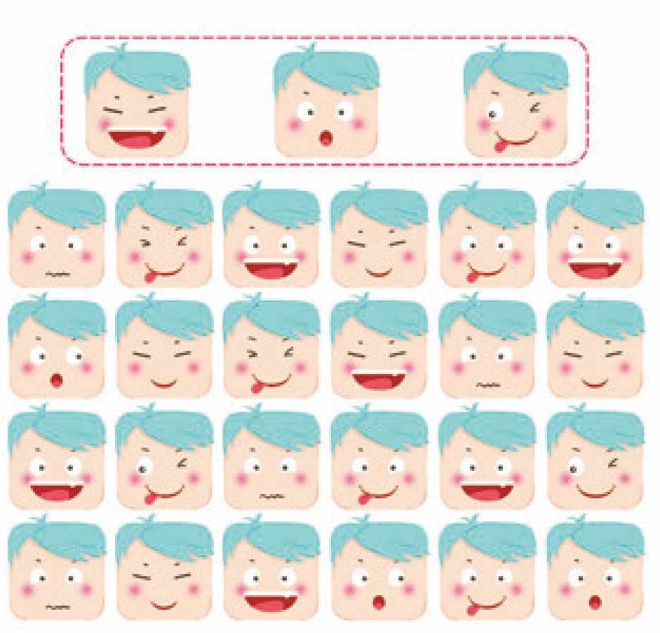 下面线框中的这三个表情就藏在表情墙中,你能找到它们并用笔圈出来吗?