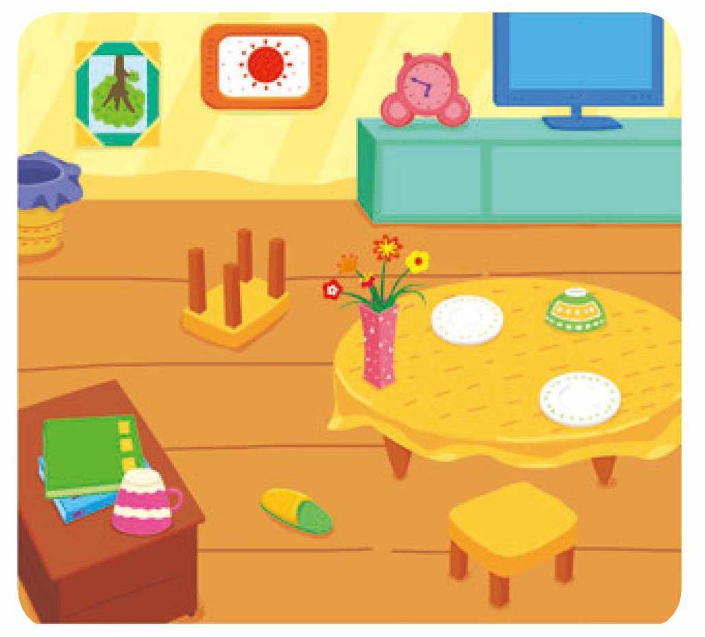 请你仔细观察,然后说一说房间中的哪些物品放倒了?请动手圈一圈。