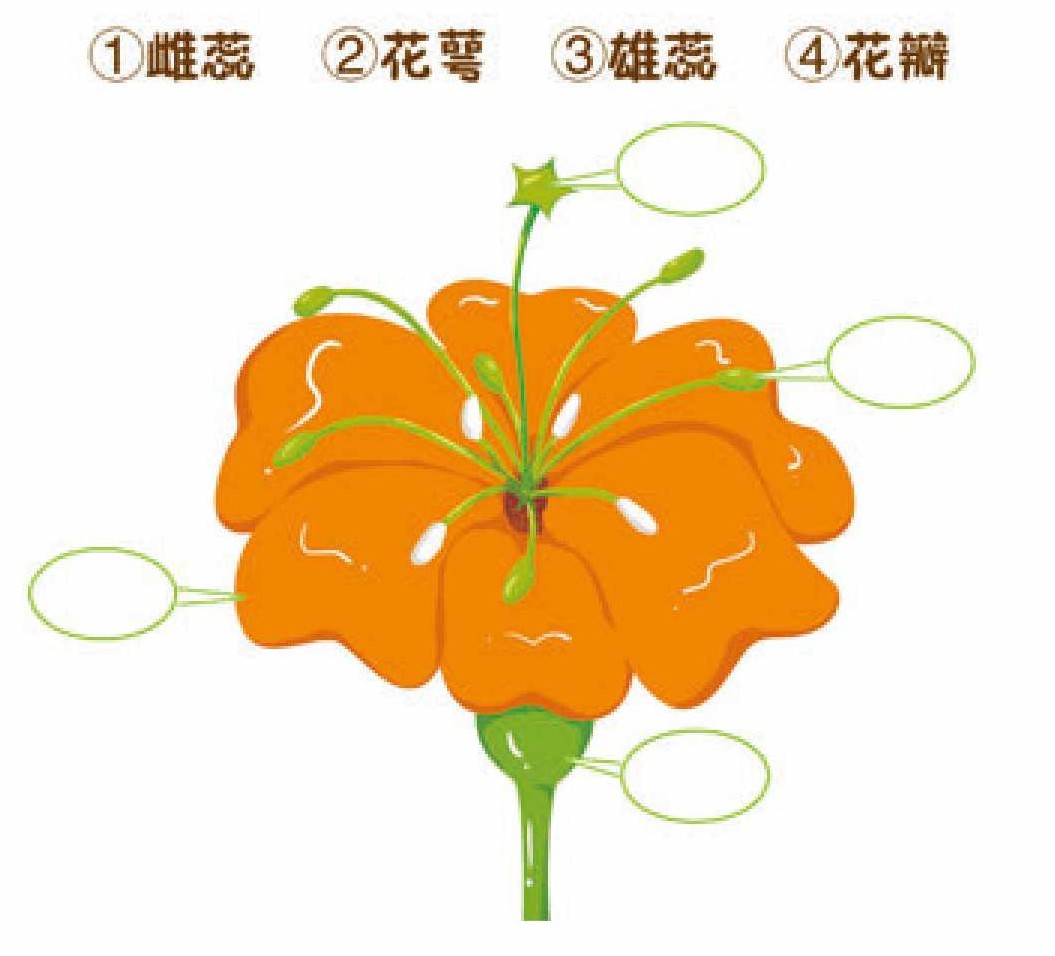 你了解花朵的构造吗?请你在妈妈的帮助下,把花朵每个部分的序号填在空白处吧!