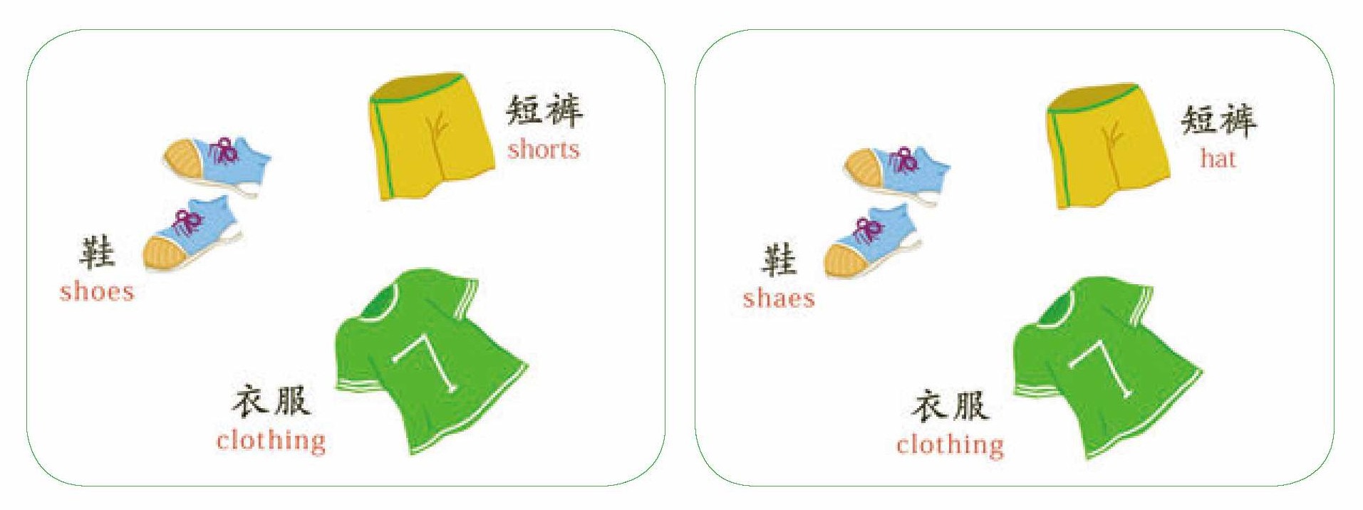 请你和妈妈一起记一记左图这些服饰对应的汉语和英文名称,记完请遮住。仔细观察右图,然后根据记忆说一说,哪些服饰的英文名称是不正确的。请你用笔圈出来!