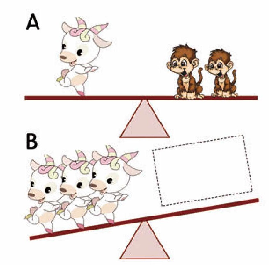 在B图中,跷跷板的另一端应站几只小猴子才能保持平衡?请你说一说。