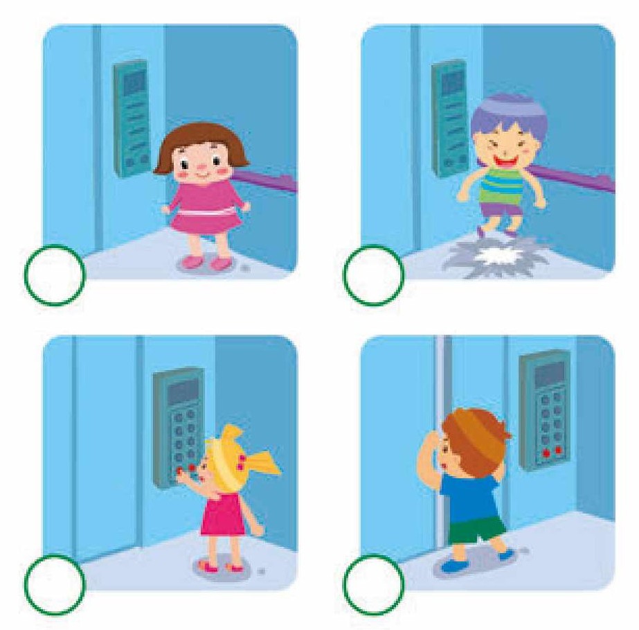 下图中哪些小朋友在乘坐电梯时的做法是对的,哪些小朋友的做法是不对的呢?请你用“√”或者“X”标在图中圆圈中吧!