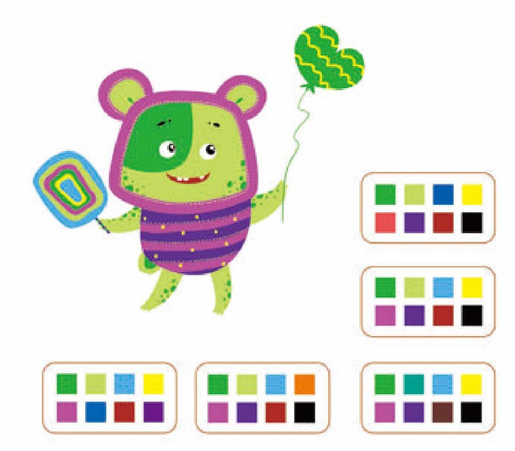 照样子,在下面的格子里画上相同的图画,并涂上颜色吧!