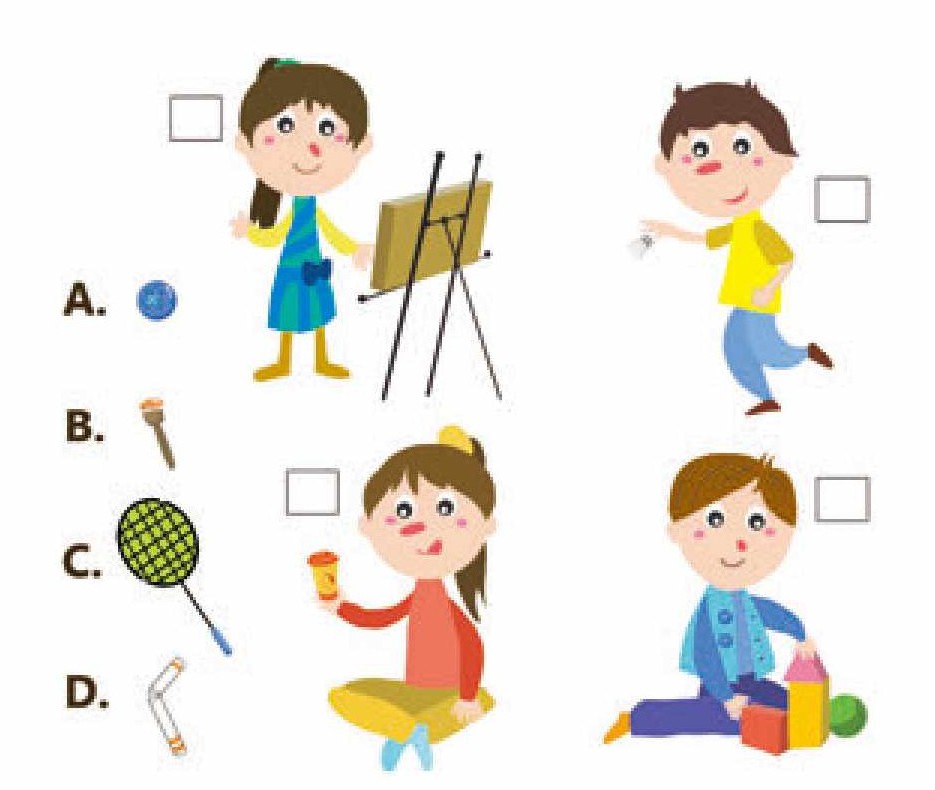 仔细观察画面上的4件物品,它们应该分别属于哪位小朋友呢?请你把字母填在对应的方框里吧!