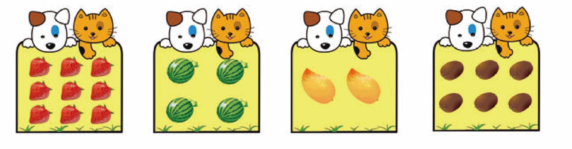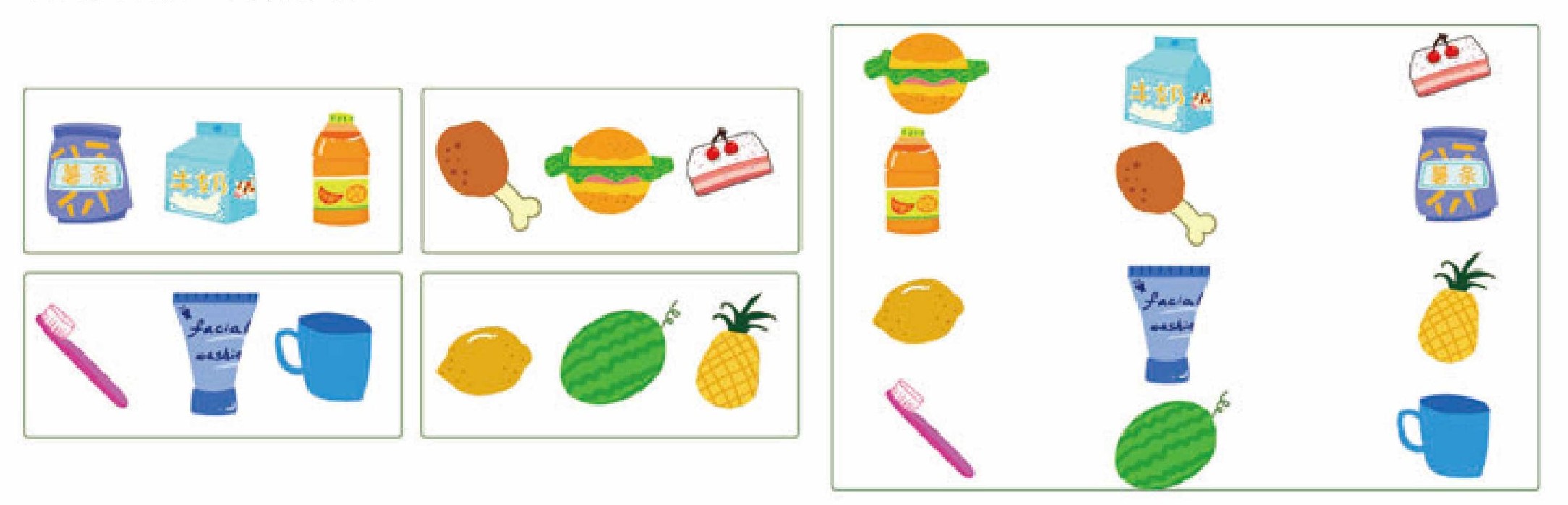 左图中每张卡片上的3件物品为一组,请你快速记下来,然后遮住,再将右图中的所有物品也分成同样的组吧!