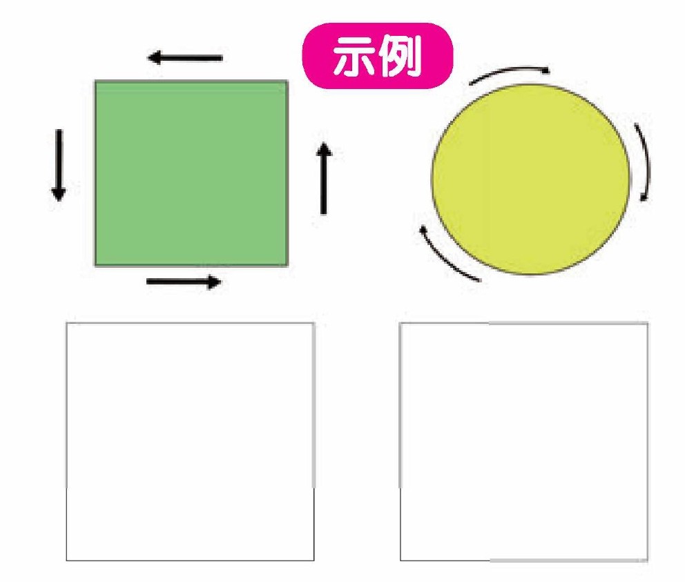 请小朋友两只手同时拿起笔,按照示例中箭头指示的方向,一只手画正方形,一只手画圆形,你快来试试吧!