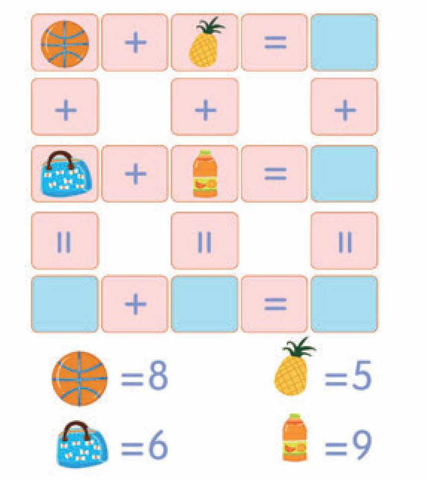 下图中给出了图案分别代表的数字,蓝色格子里应该填什么数字呢?你来填一填吧!