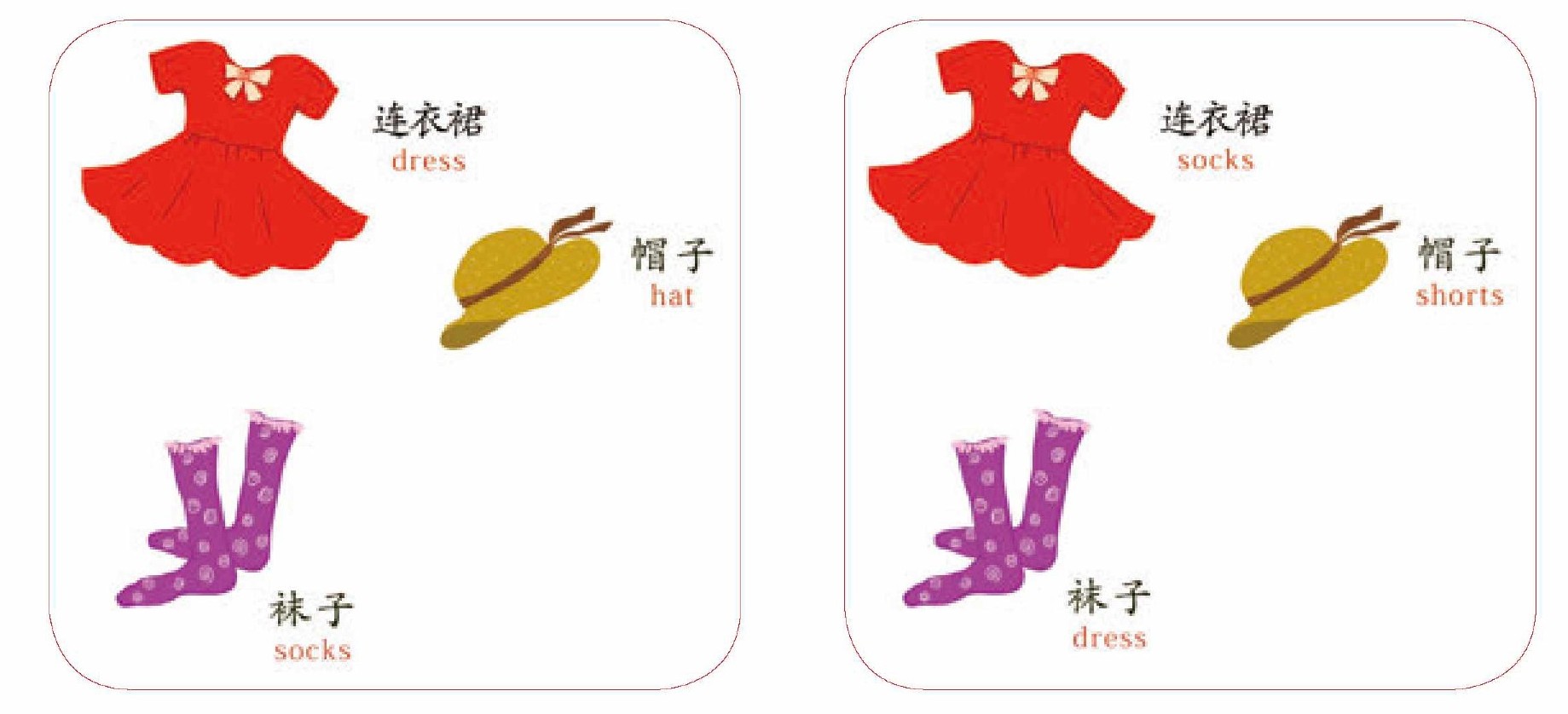仔细观察左图,然后根据记忆说一说,右图哪些服饰的英文名称是不正确的。请你用笔圈出来吧!