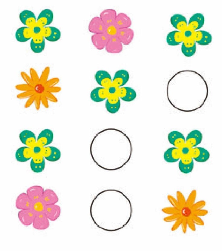 仔细观察下面花朵的排列顺序,然后在空白处回出相应的花朵。