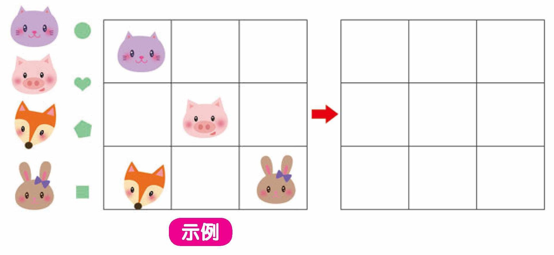 找出小动物的排列规律,给“?”处选择合适的小动物,并在其对应的方框内涂色。