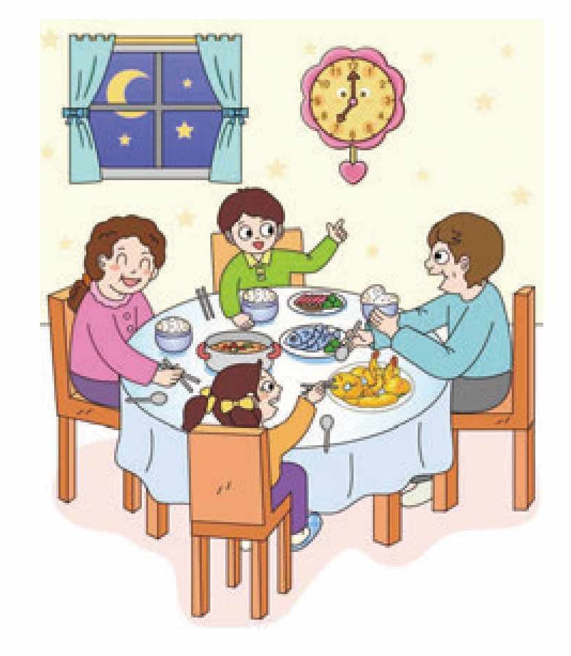 丫丫一家人吃饭啦,她好开心!说一说丫丫几点吃饭,这是早饭、午饭还是晚饭时间。