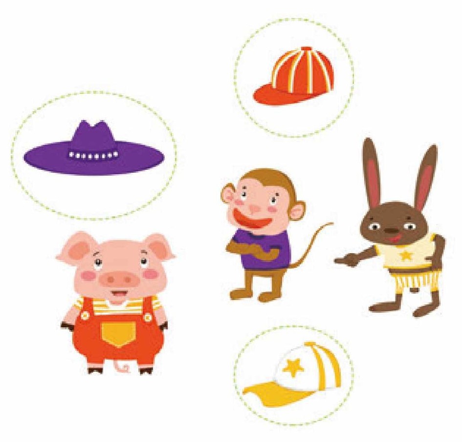 你能根据每只小动物衣服的颜色和装束风格,帮它们分别选一顶漂亮的帽子吗?请你用线连一连。